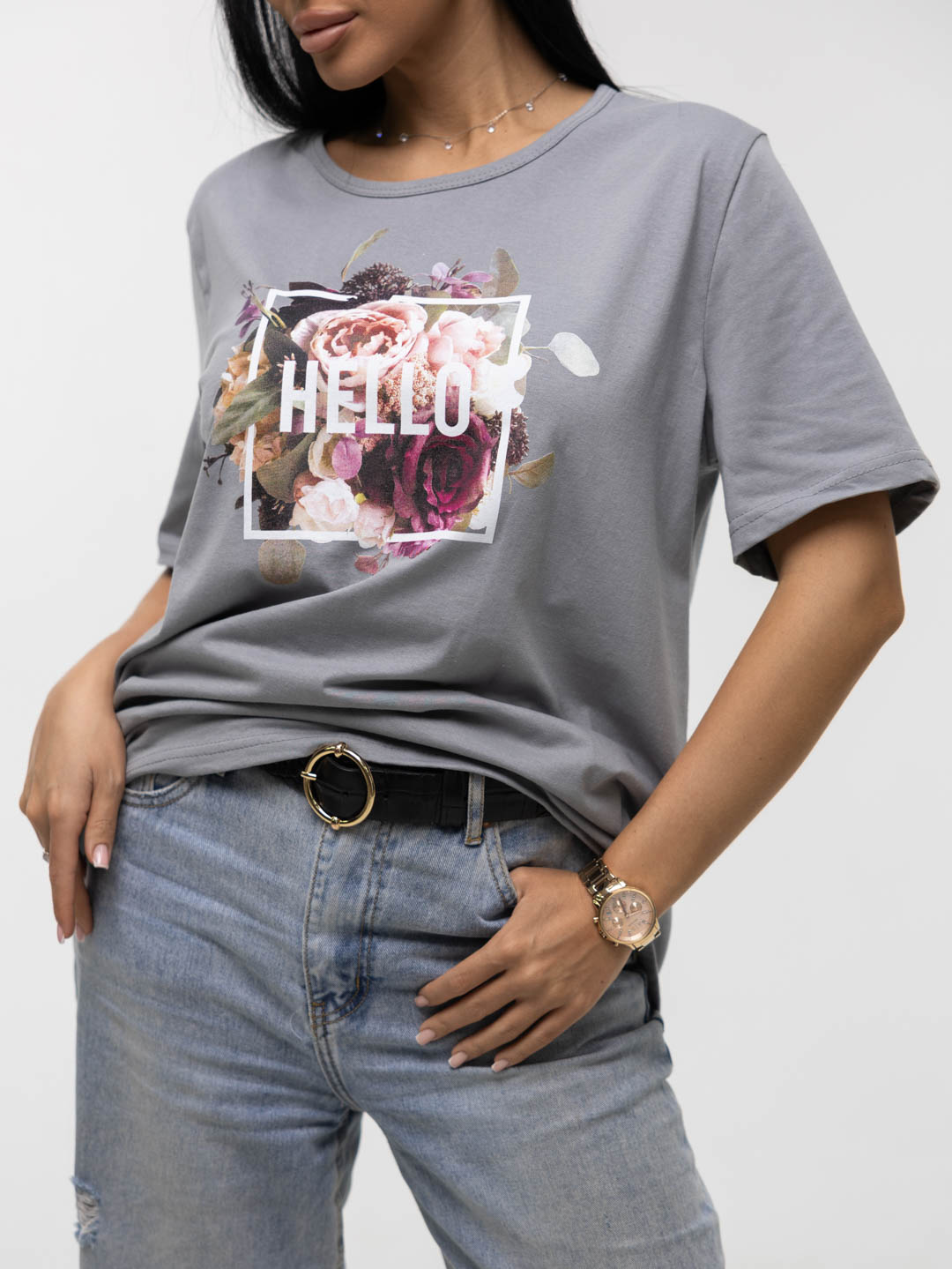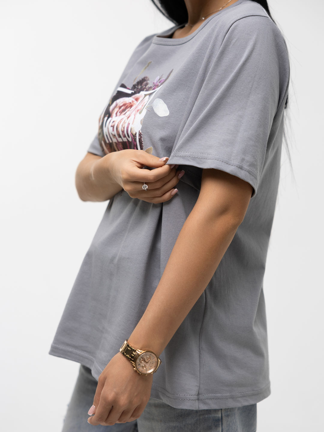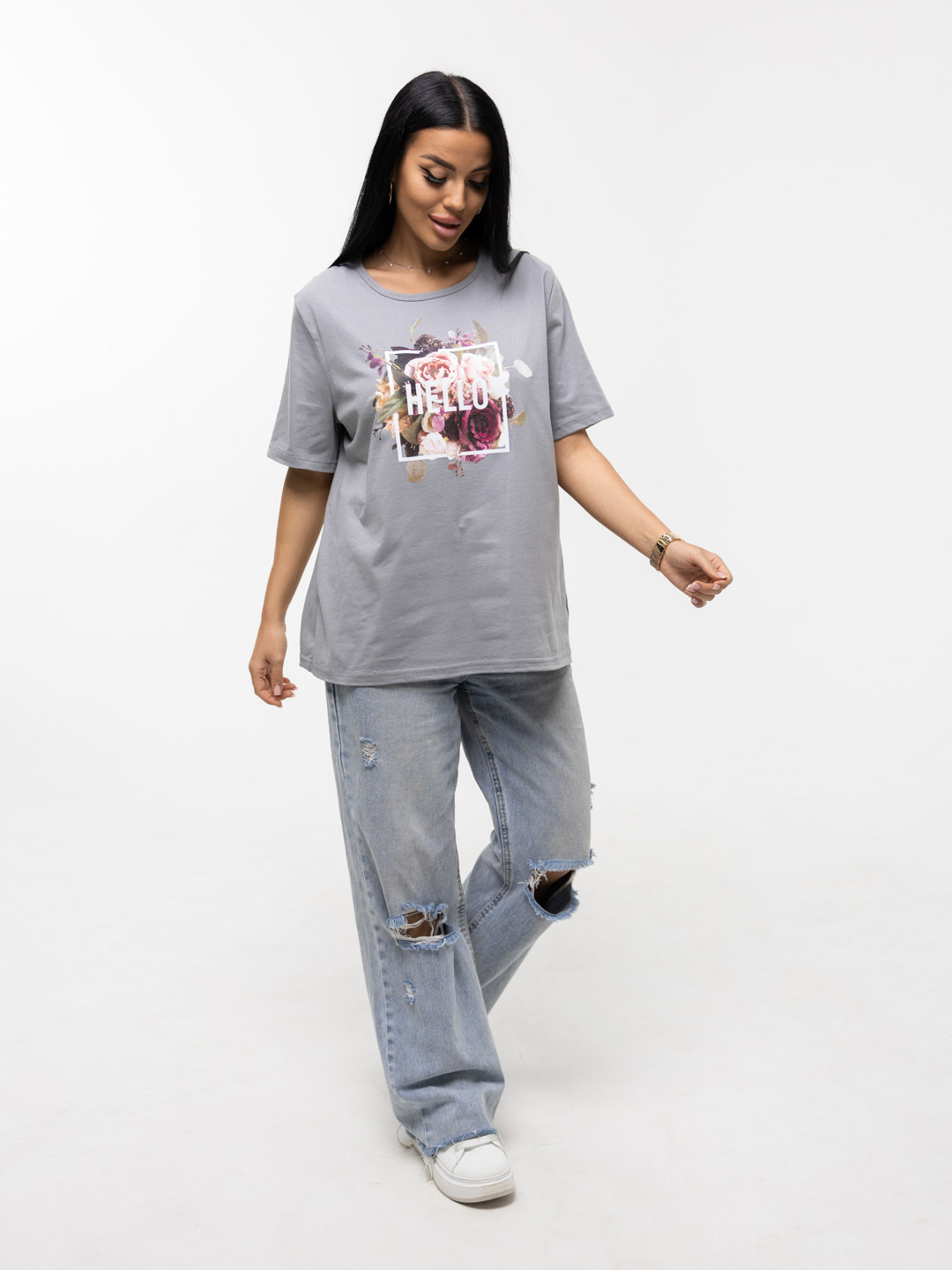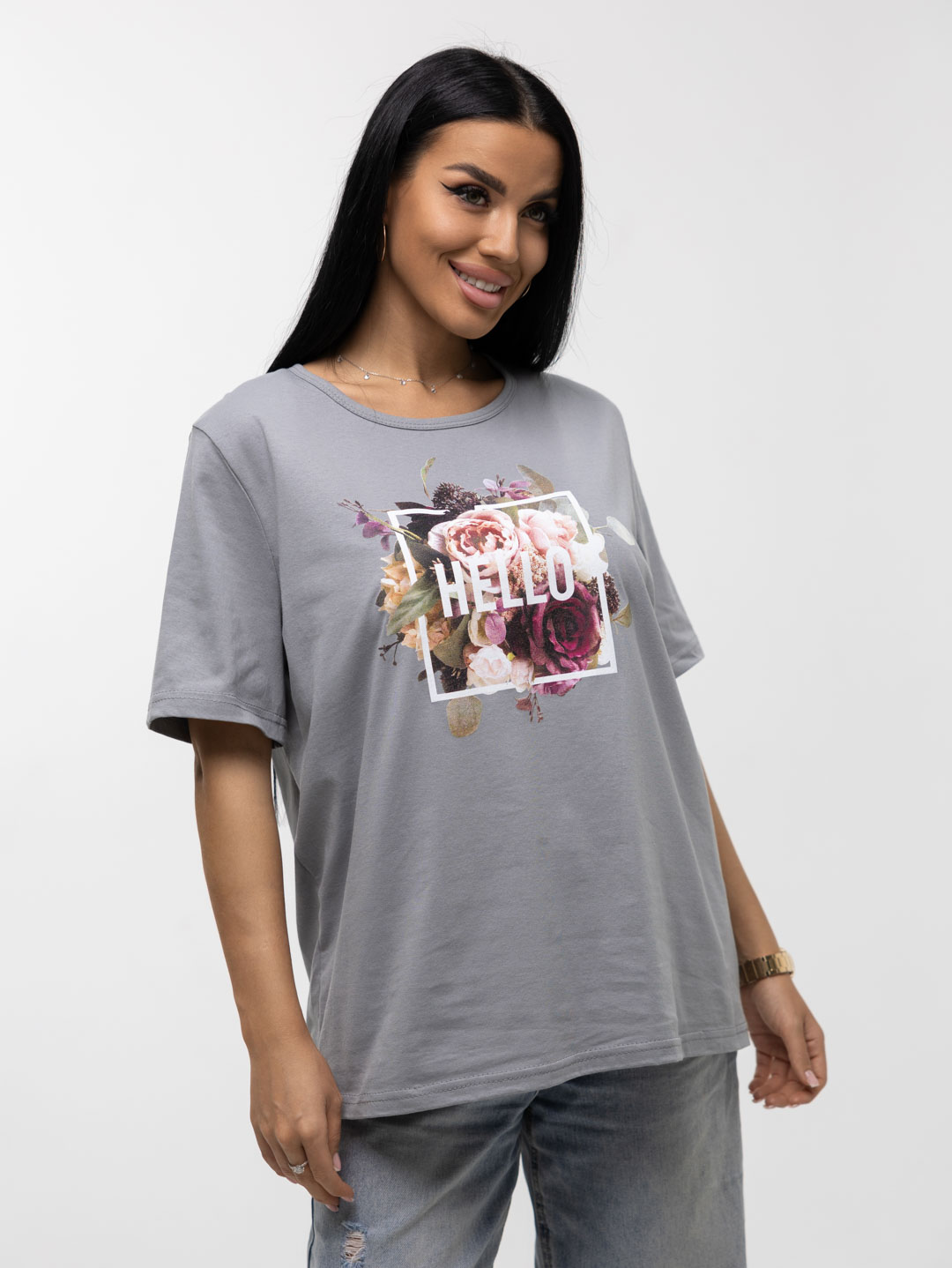 Футболка женская, прямого силуэта с принтом, О-образной горловиной. Рукав короткий, свободный. Футболка выполнена из трикотажного полотна 100% хлопка.
