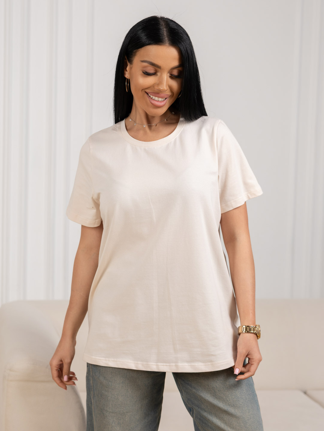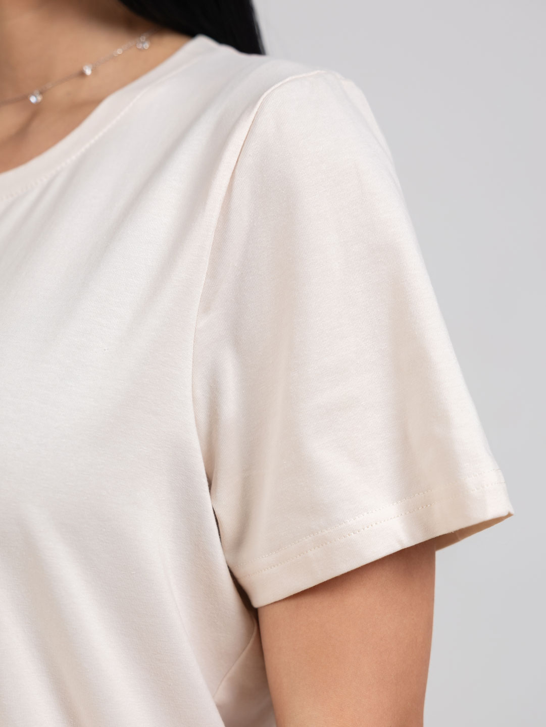 Женская базовая футболка трендового оттенка, с втачным рукавом, О-образной горловиной, длиной до середины бедра.
