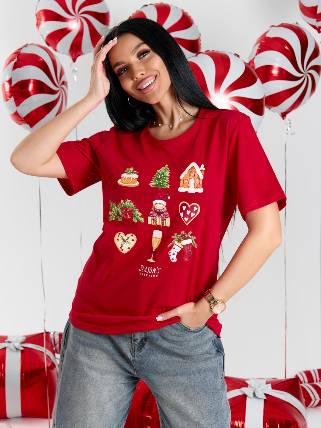Эта футболка с новогодним принтом создана для тех, кто любит атмосферу зимних праздников. Яркие краски сразу вызывают ассоциации с тёплыми семейными вечерами, подарками под ёлкой и ароматом имбирного печенья. Классическая футболка с коротким рукавом и О-образной горловиной, будет отлично смотреться как за новогодним столом, так и в канун праздников.