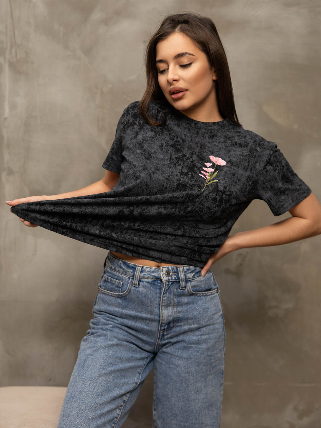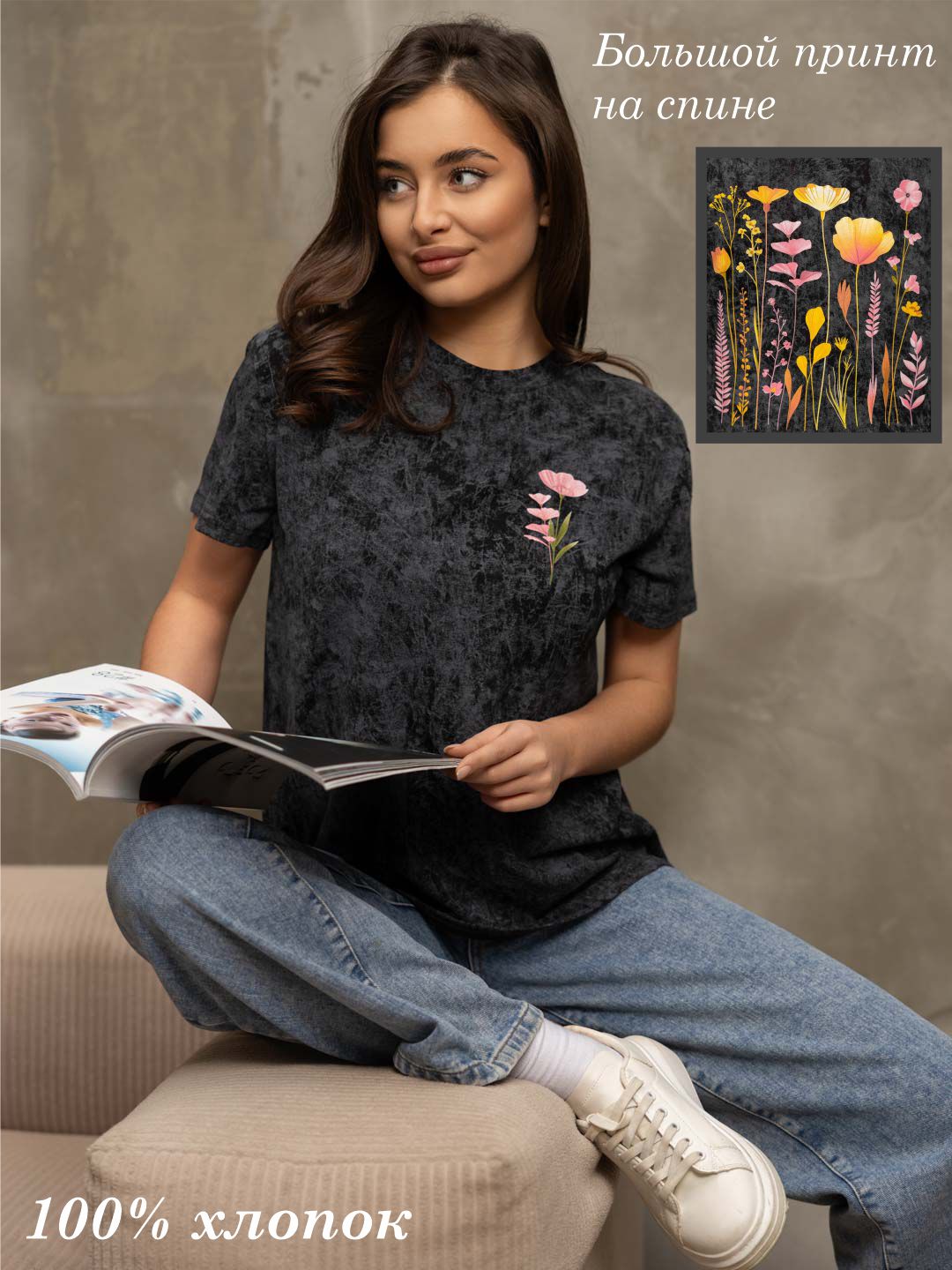 Базовая женская футболка из 100% хлопка с эффектом варенки, умеренного обьема, О-образной горловиной и коротким рукавом. По горловине, рукаву и низу изделия - декоративная строчка. Спереди и сзади нанесен принт "Желтые маки". Рост модели 167см.