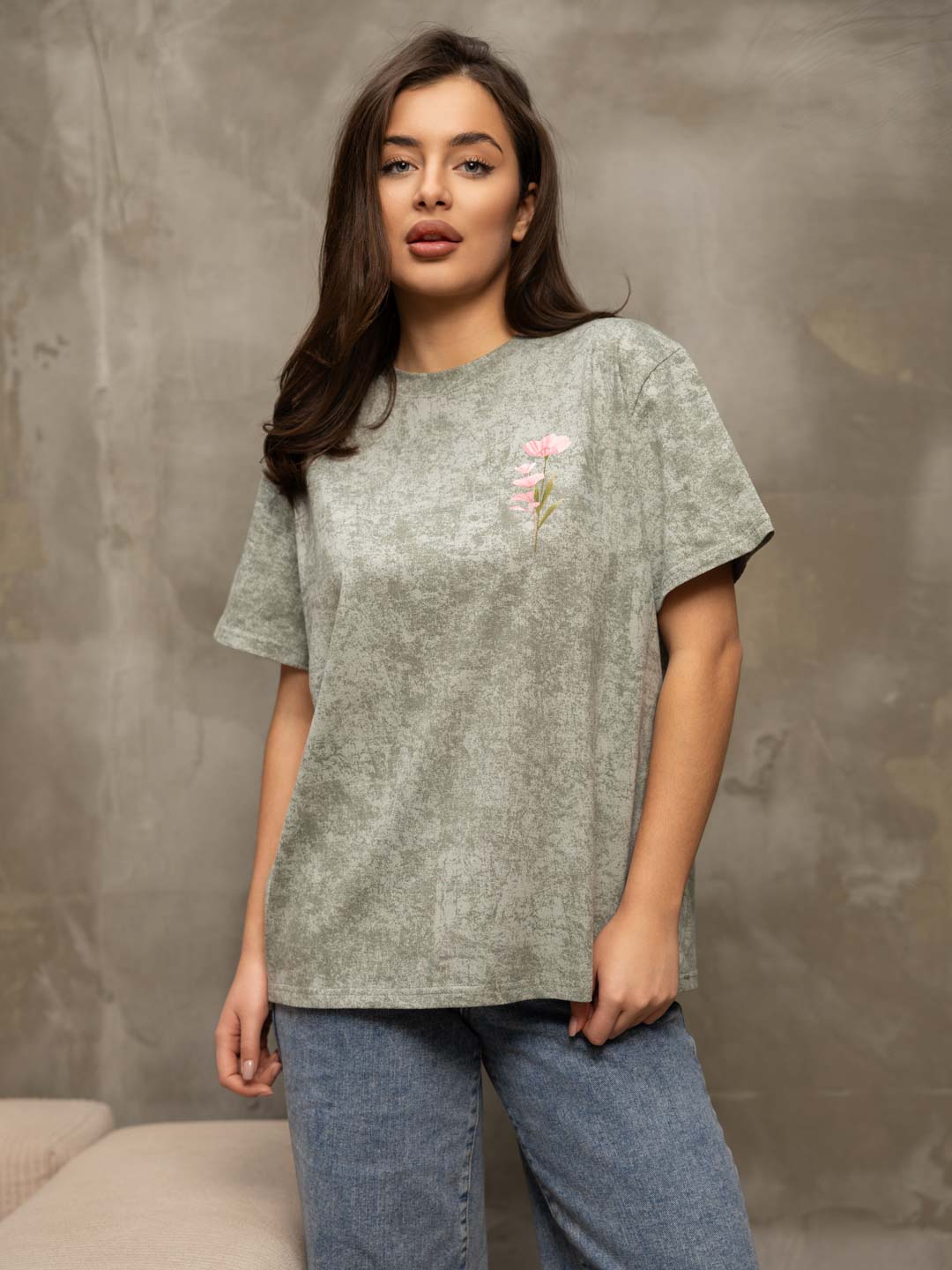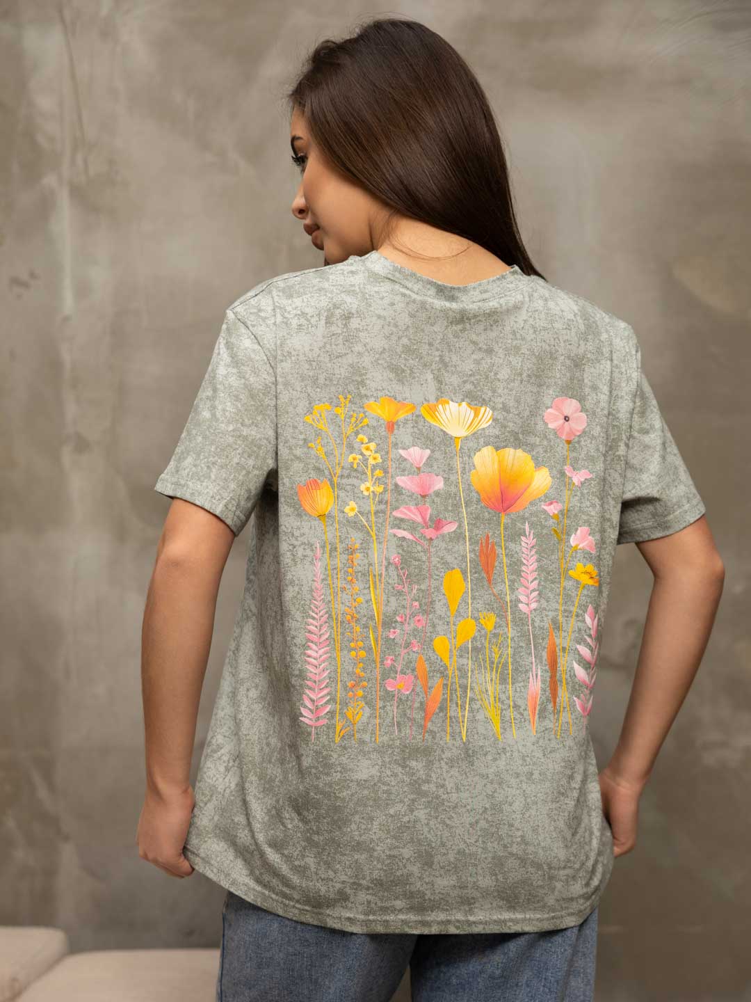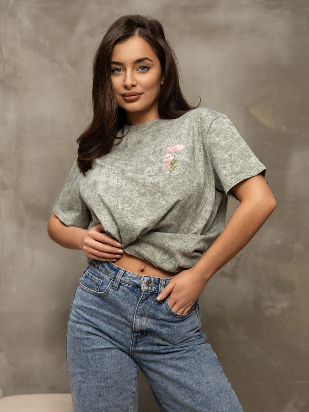 Базовая женская футболка из 100% хлопка с эффектом варенки, умеренного обьема, О-образной горловиной и коротким рукавом. По горловине, рукаву и низу изделия - декоративная строчка. Спереди и сзади нанесен принт "Желтые маки". Рост модели 167см.
