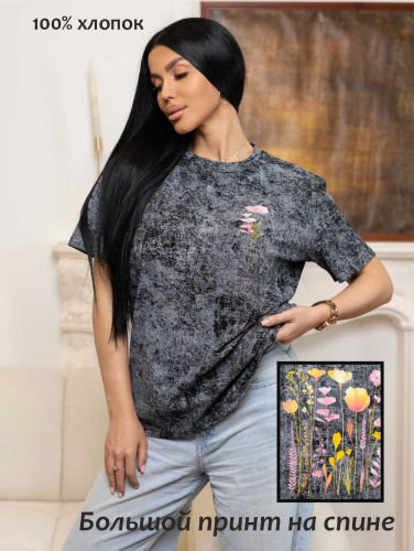 Базовая женская футболка из 100% хлопка с эффектом варенки, умеренного обьема, О-образной горловиной и коротким рукавом. По горловине, рукаву и низу изделия - декоративная строчка. Спереди и сзади нанесен принт "Желтые маки". Рост модели 165см.