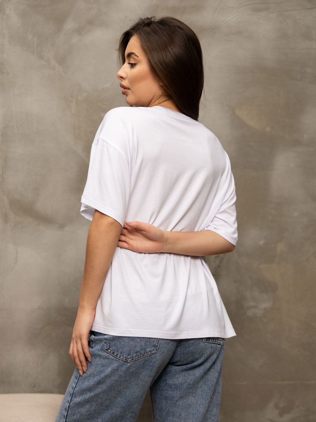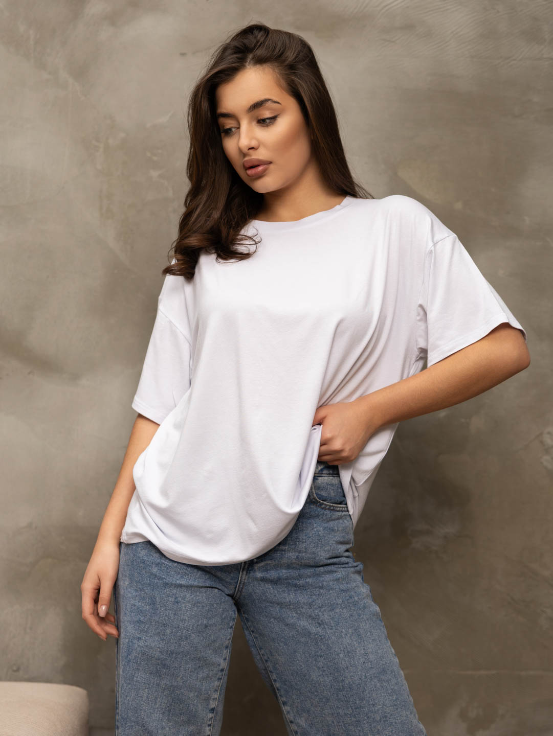Базовая белая футболка из качественной вискозы, спущенная линия плеча, О-образная горловина, модный силуэт оверсайз. То что нужно в качестве базы под пиджак, кардиган, бомбер.