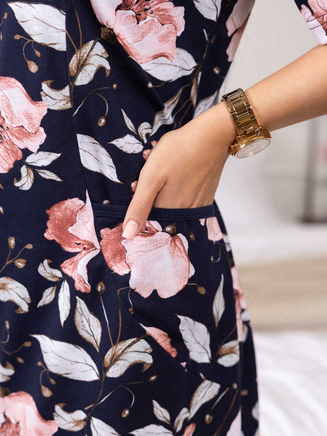 Халат женский полуприлегающего силуэта из трикотажного полотна «кулирка» длинной до уровня колена. На полочке отрезные бочки с карманами. Рукав втачной базового покроя, короткий. Вырез горловины О-образный. Изделие на молнии.