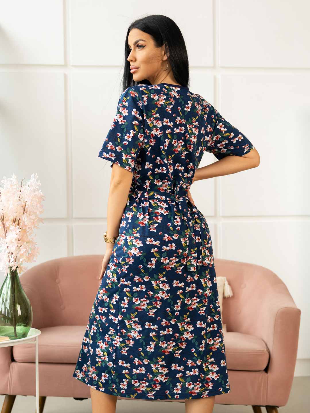 Халат женский из трикотажного полотна - кулирка, длиной ниже колена, прямого силуэта. Полочка с рельефами и карманами в них. Рукав втачной базового покроя длиной до линии локтевого сгиба.