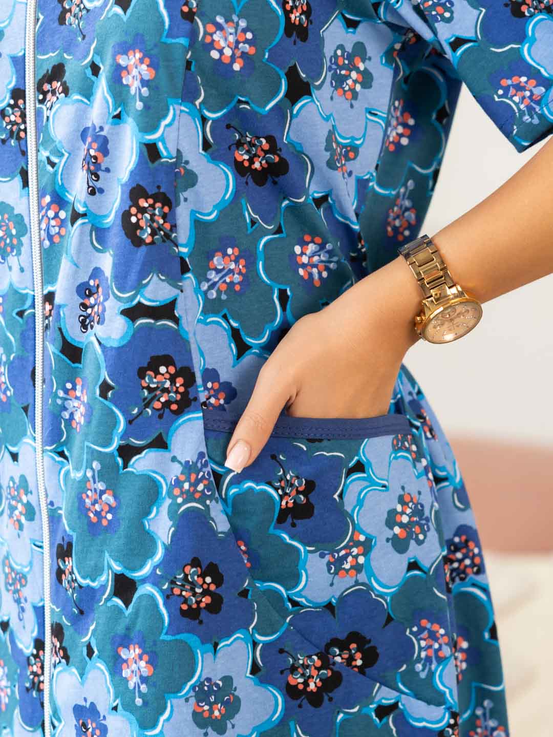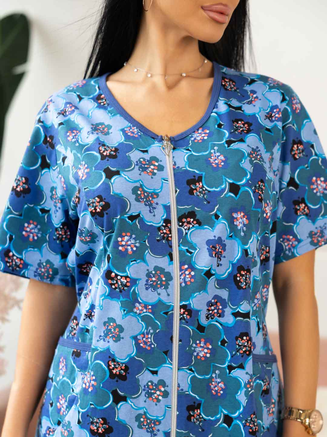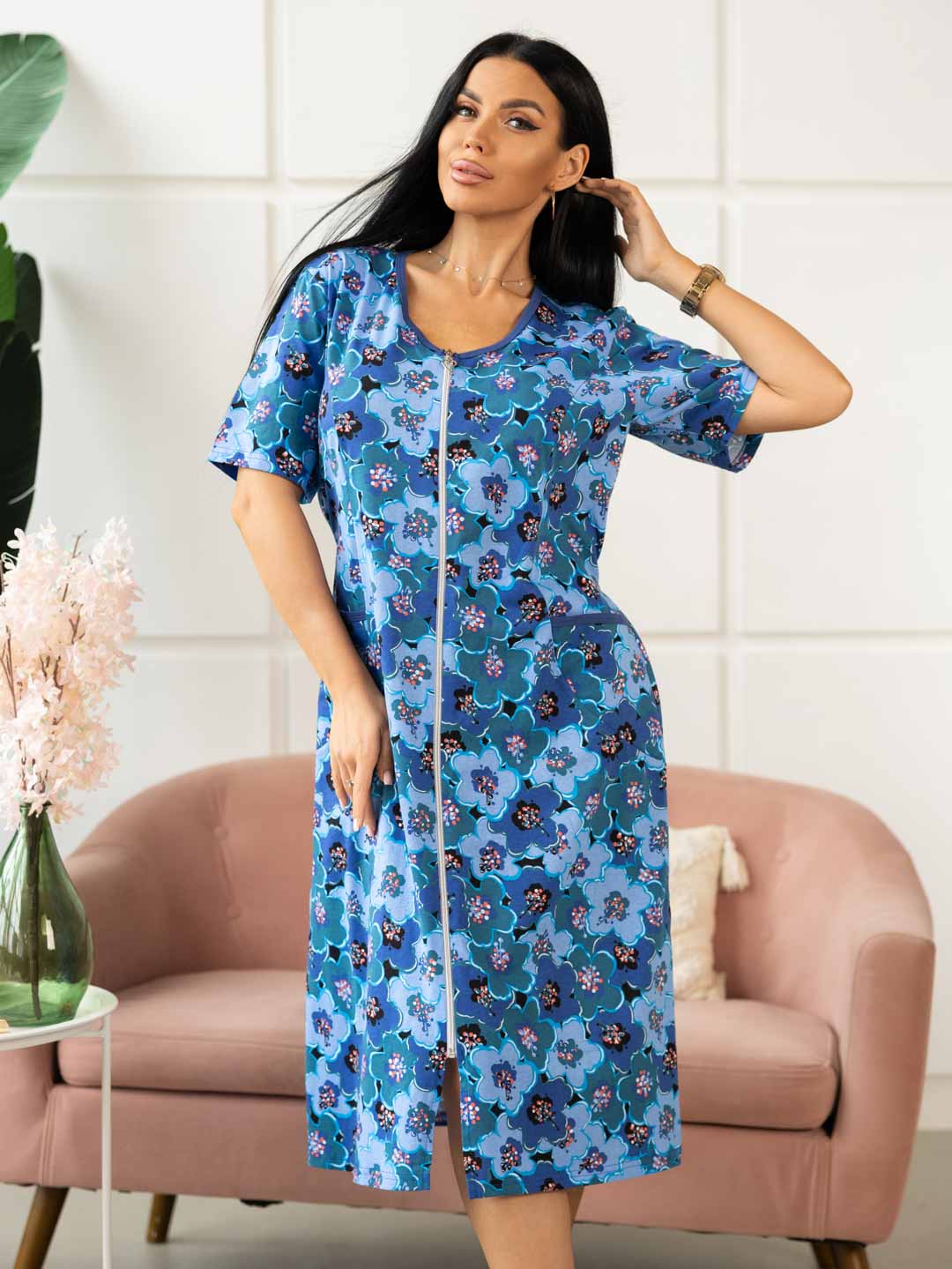 Халат женский из трикотажного полотна - кулирка, длиной ниже колена, прямого силуэта. Полочка с рельефами и карманами в них. Рукав втачной базового покроя длиной до линии локтевого сгиба.