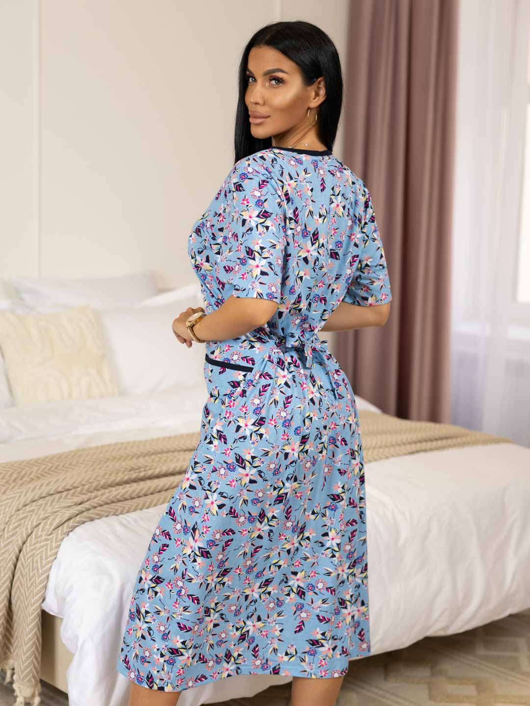 Халат женский из трикотажного полотна - кулирка, длиной ниже колена, прямого силуэта. Полочка с рельефами и карманами в них. Рукав втачной базового покроя длиной до линии локтевого сгиба.
