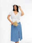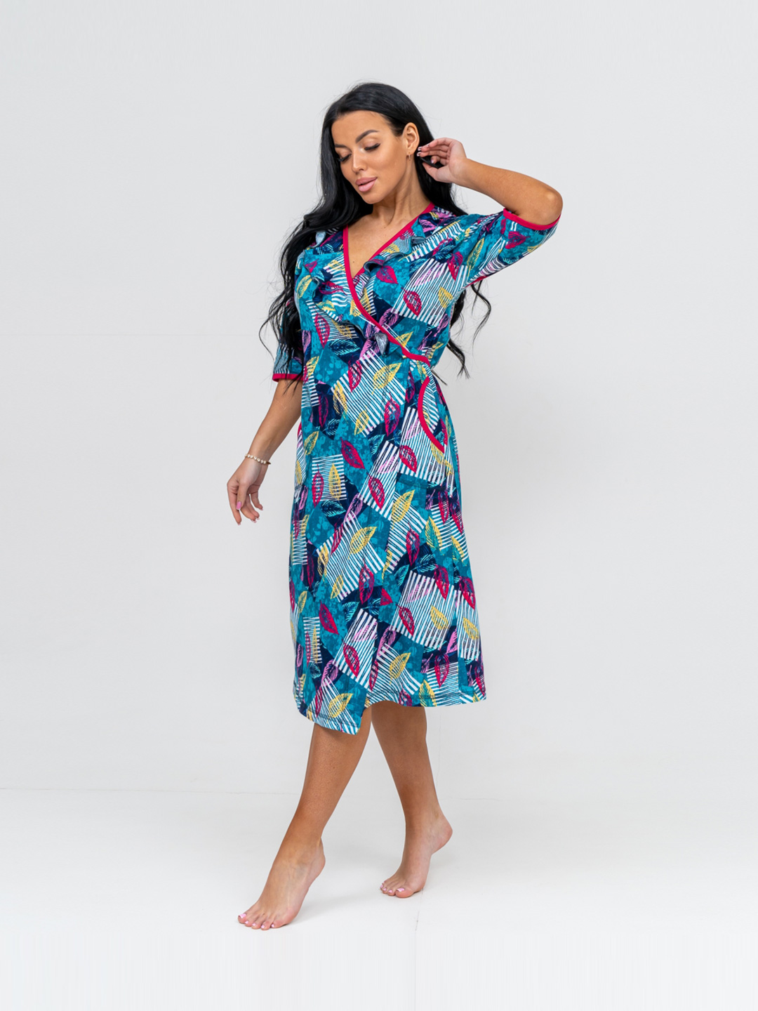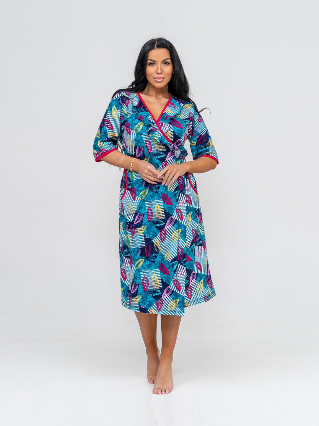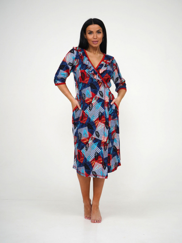 Халат женский из трикотажа с воротником типа шаль. На полочке присутствуют два кармана. Рукав втачной базового покроя, длиной 3/4.