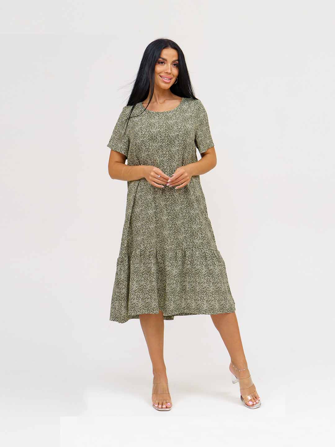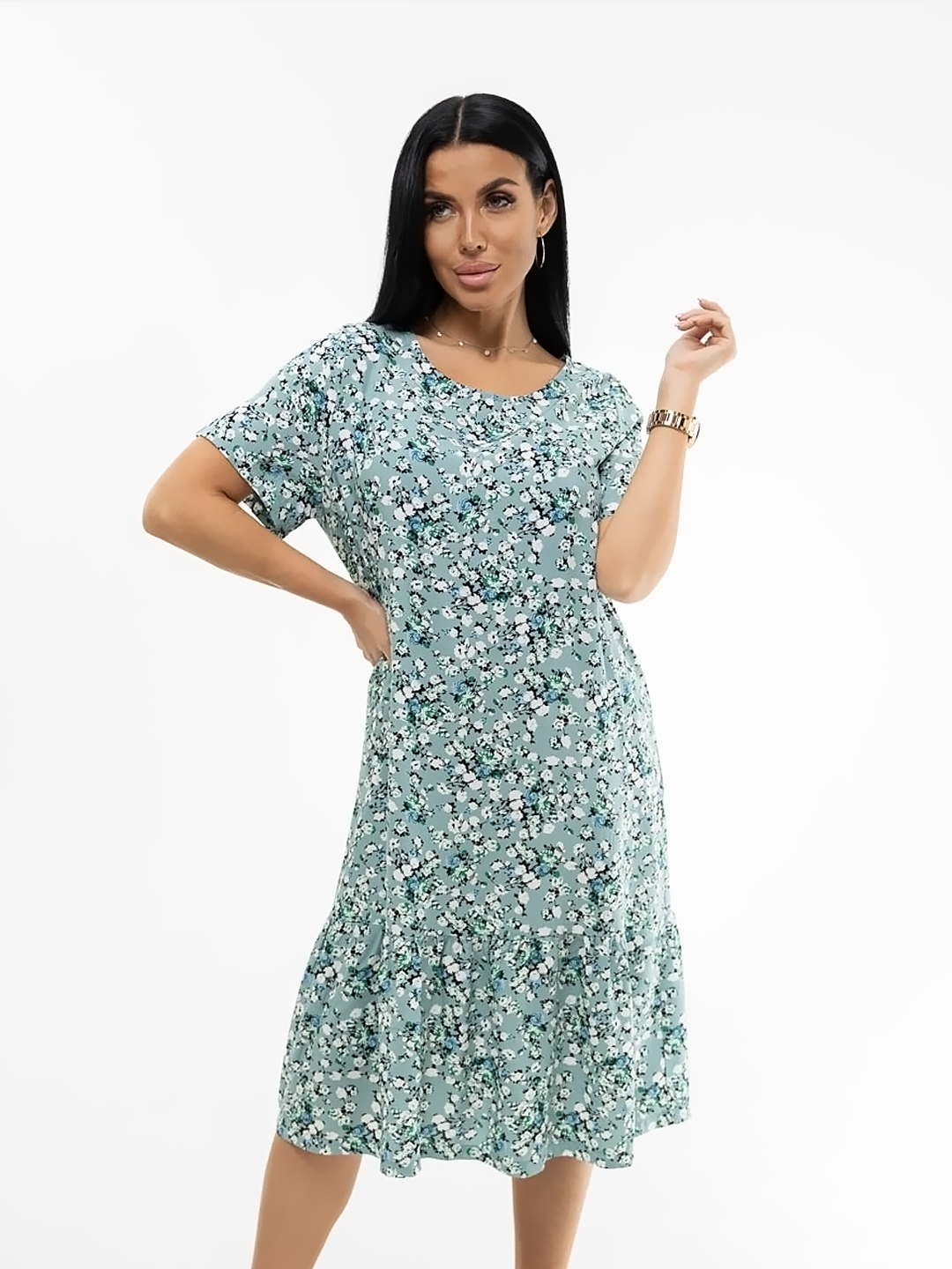 Халат женский домашний из трикотажа, длиной чуть ниже колена. Рукав - цельнокройный, короткий. Вырез горловины V-образный. На полочке застежка на пуговицы и накладные карманы.