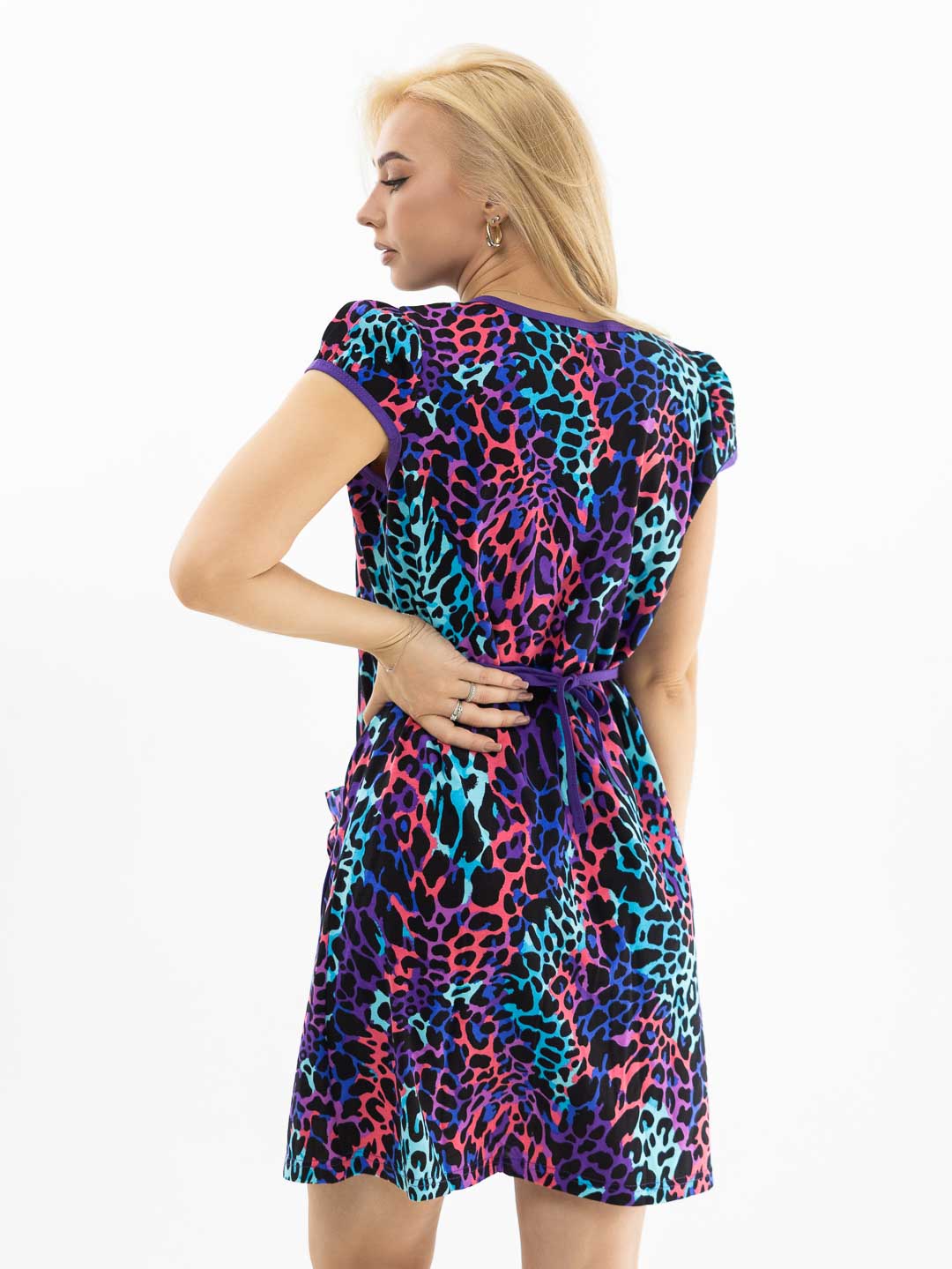 Халат женский полуприлегающего силуэта из трикотажного полотна кулирка длиной выше уровня колена. На полочке два накладных кармана со сборкой. Вырез горловины О-образный. Рукав крылышко-фонарик.