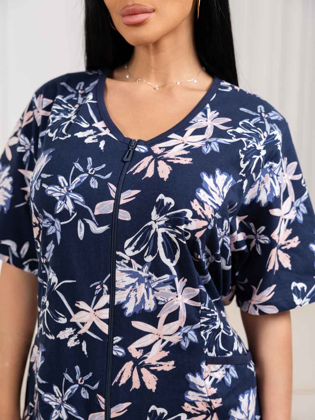 Халат женский из 100% хлопка, полуприлегающего силуэта длиной чуть ниже уровня колена. Халат на молнии, спереди накладные карманы, горловина обработана окантовкой, сзади пояс для приталивания по фигуре. Рост модели 165см.