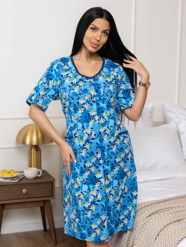 Халат женский из трикотажа, длиной до уровня колена. Рукав - втачной, длиной 1/2. Вырез горловины О-образный. Застежка на пуговицы.