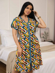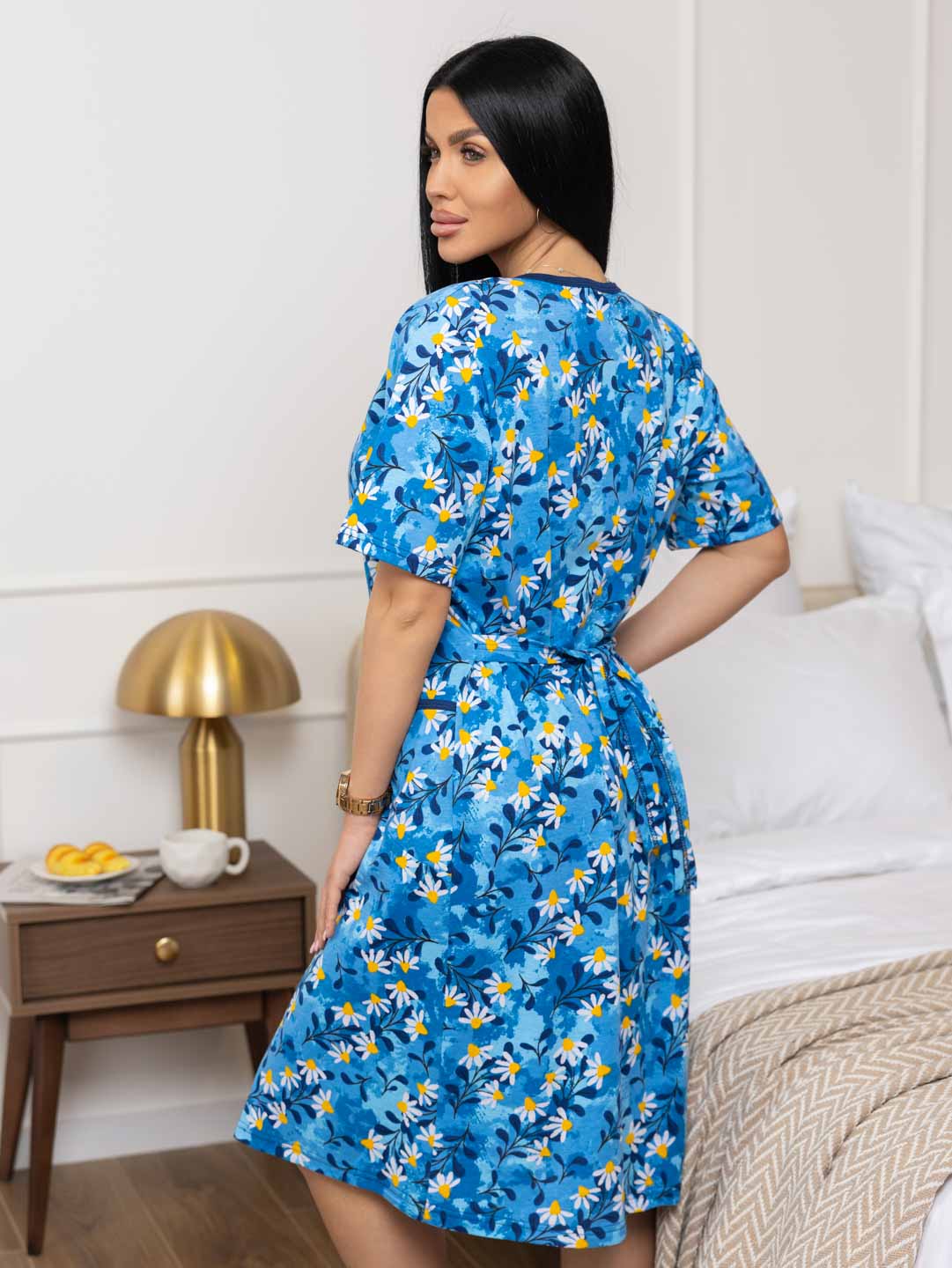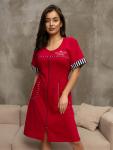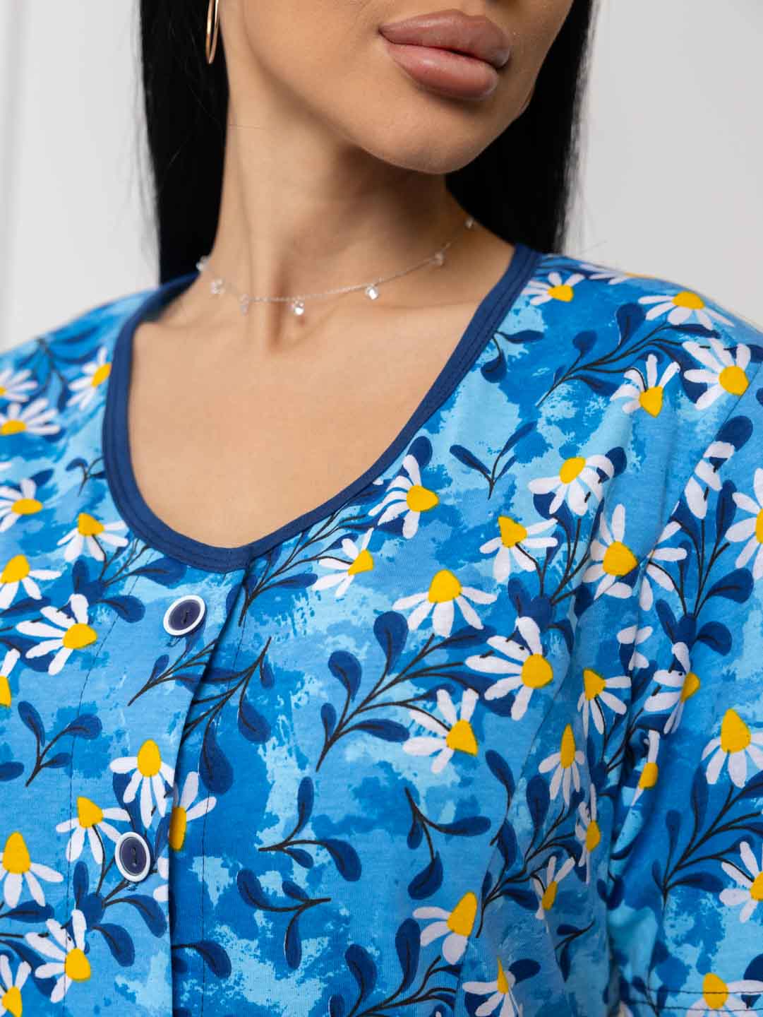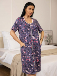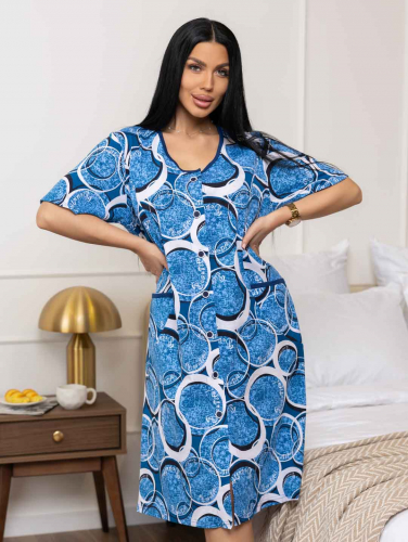 Халат женский из трикотажа, длиной до уровня колена. Рукав - втачной, длиной 1/2. Вырез горловины О-образный. Застежка на пуговицы.