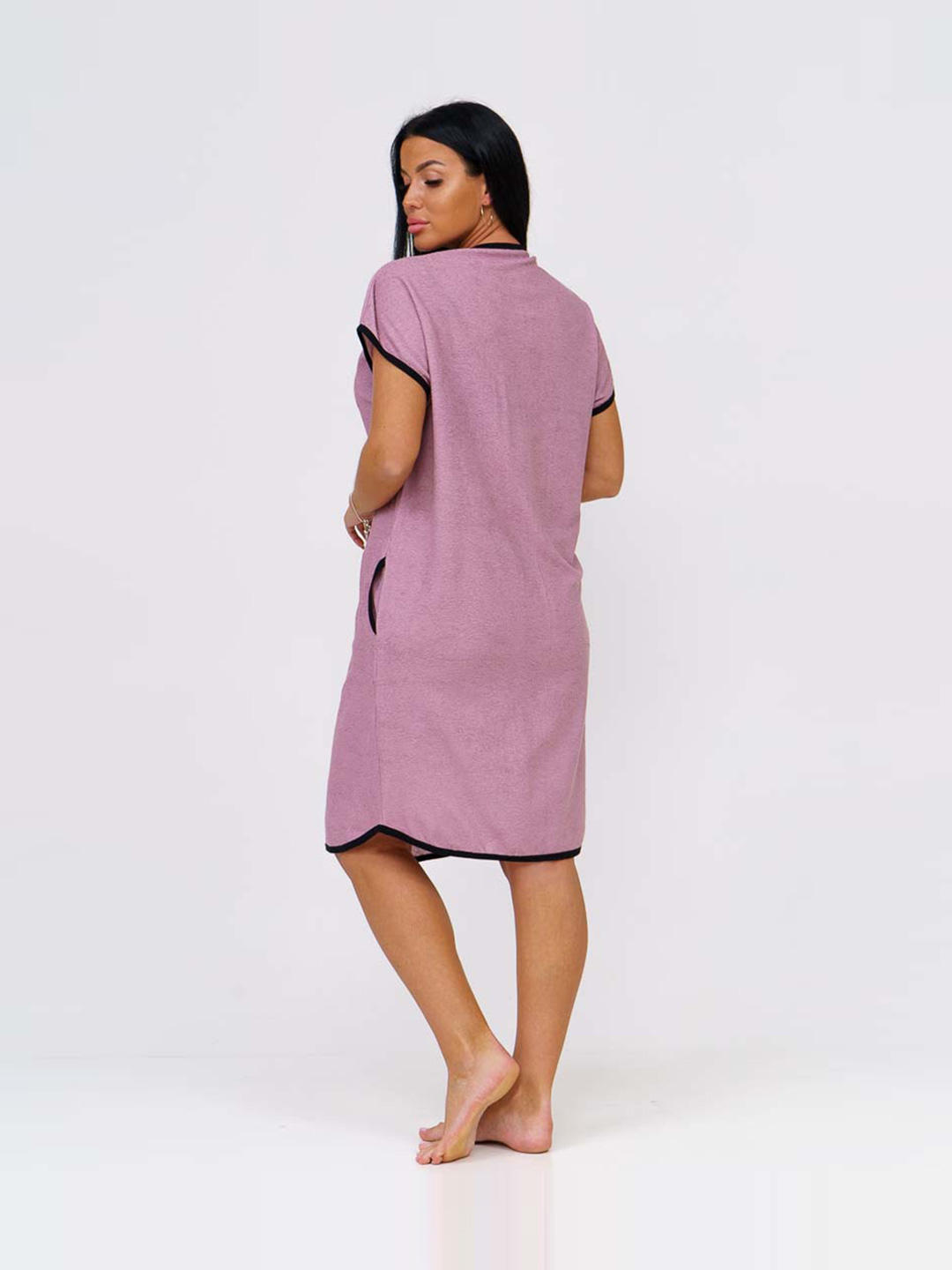Женский домашний халат, полуприлегающего силуэта с застежкой на молнию. Два втачных кармана. О - образный вырез горловины.