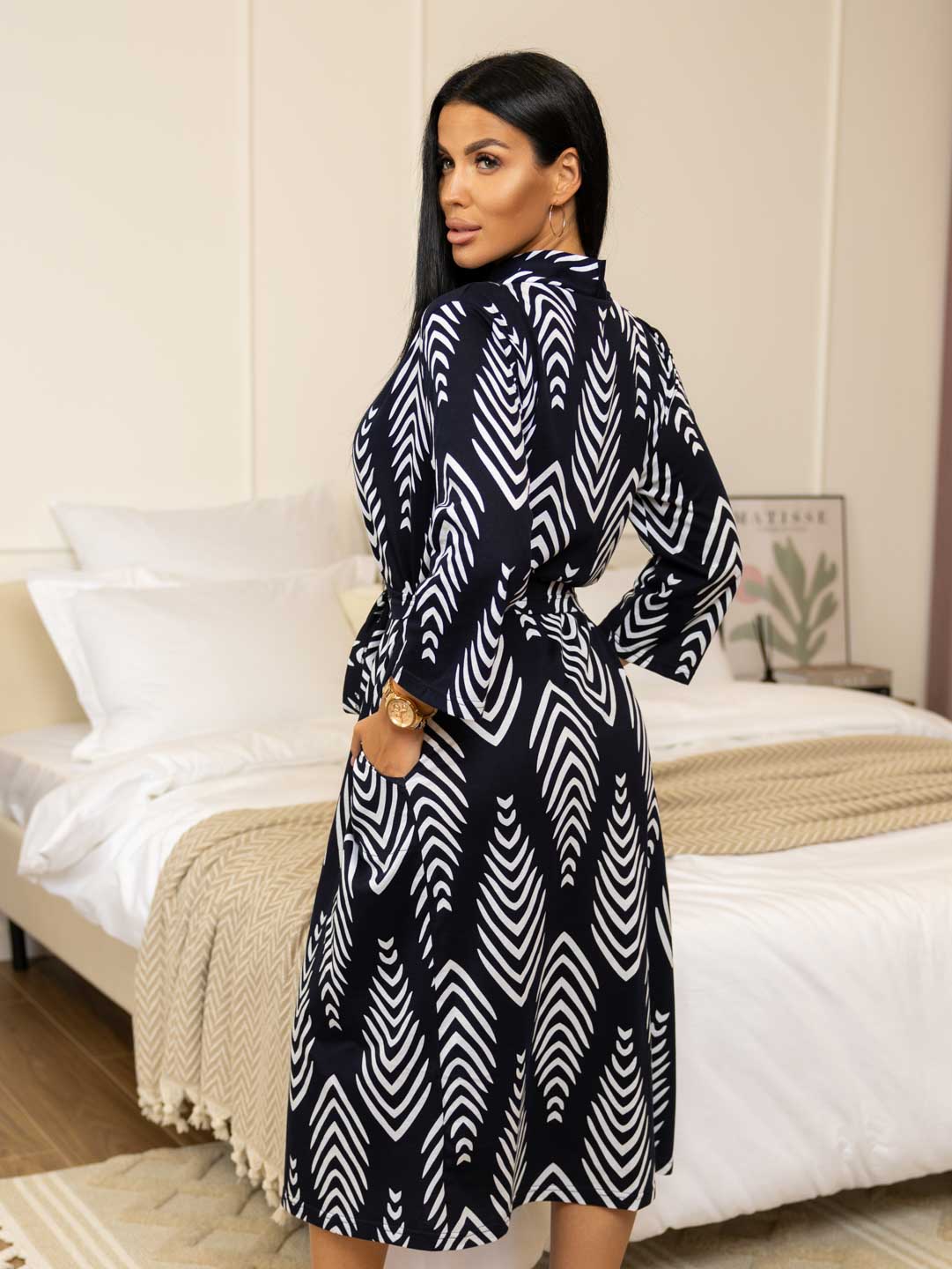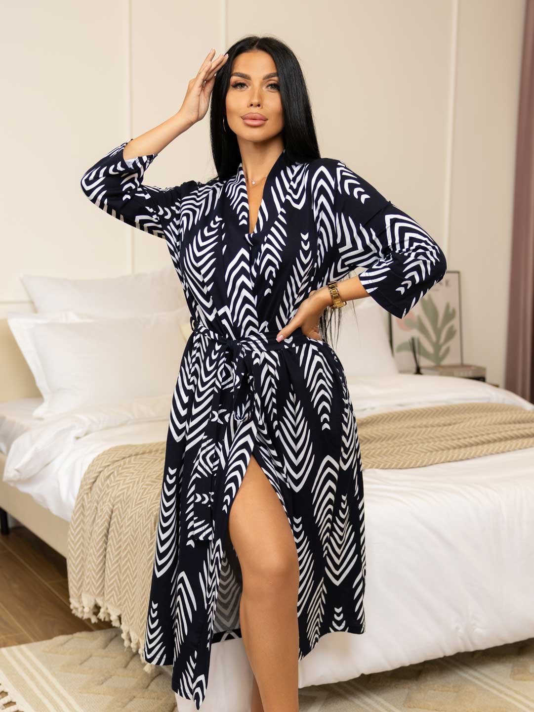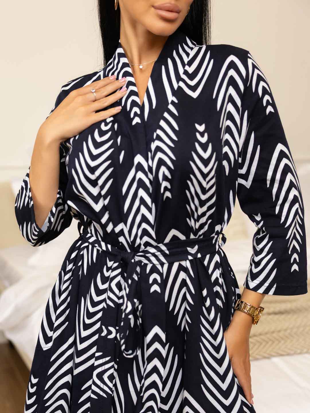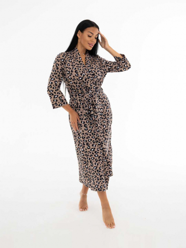 Халат женский из трикотажа. На полочке присутствуют два кармана. Рукав втачной базового покроя, длиной 3/4.
