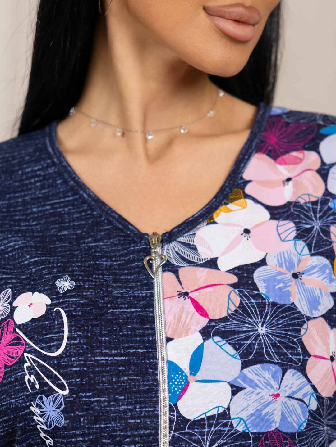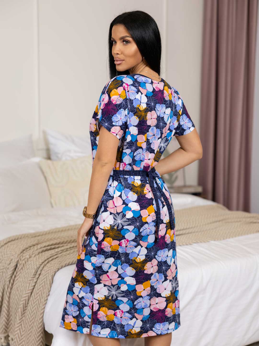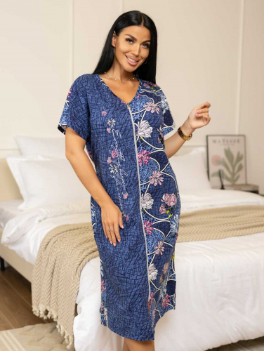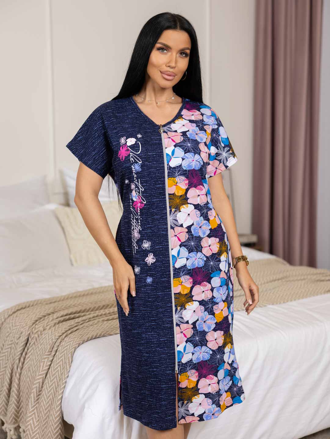 Халат домашний на молнии, с цельнокроенным рукавом и округлой горловиной. В боковых швах удобные карманы. В нижней части - вырезы, для большей свободы движения. На спинке имеются завязки, для регулировки ширины изделия по талии.