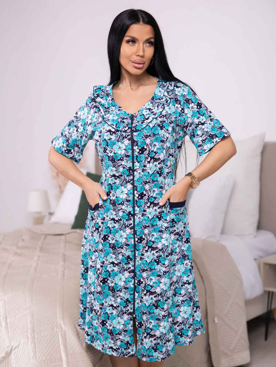Женский халат на молнии из хлопка, с рельефами, карманами в бочке и воланом по кокетке, сзади пояс из основного материала. Волан обработан роликовым швом, карманы обработаны обтачкой компаньоном к осномному материалу.