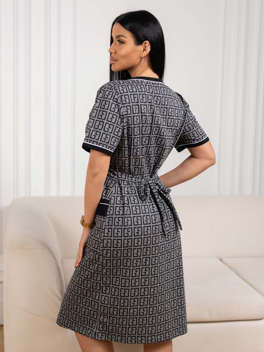 Халат из кулирки на молнии приталенного силуэта с контрастной отделкой по накладным карманам, горловине и рукавам. Халат средней длины, с пояском сзади. Рост модели на фото 165см.