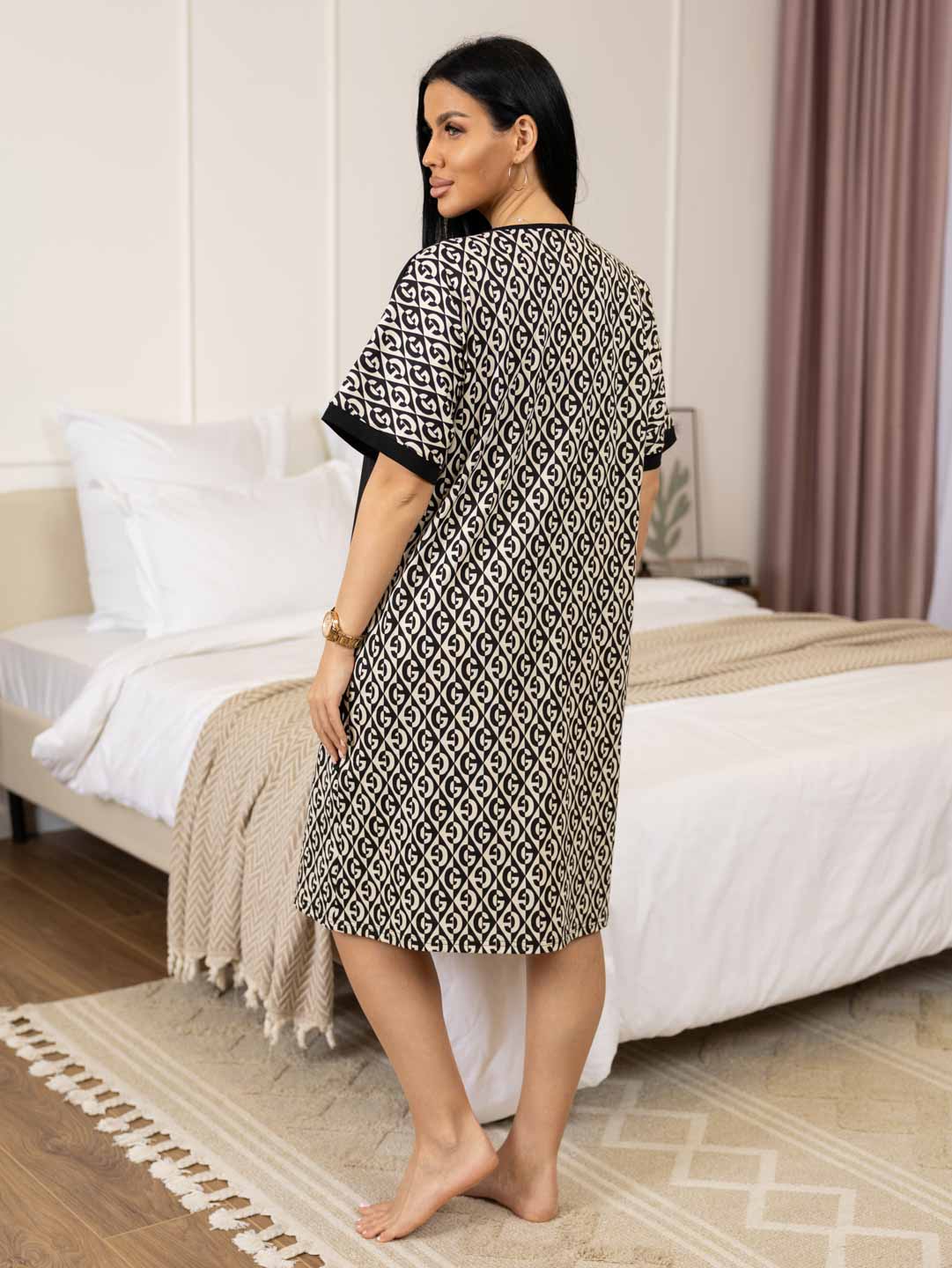 Женский комбинированный халат с принтом на молнии. Залат прямого силуэта с о-образной горлдовиной и карманами в боковых швах.