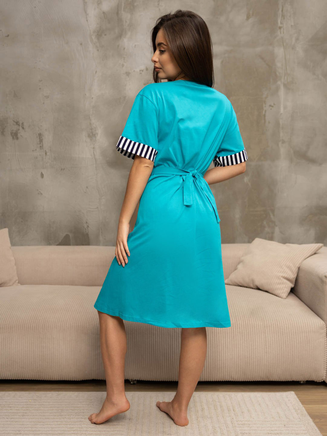 Женский халат из хлопка, на молнии, длиной чуть ниже колена, с контрастными вставками по кокетке, рукаву и карману. На кокетке печать с эффектом мерцания. Рост модели 167.