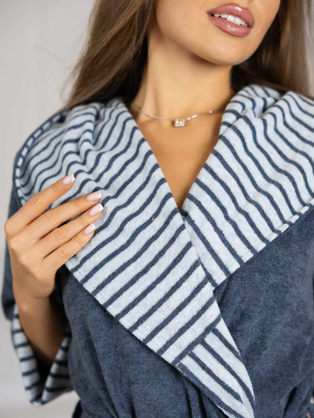 Халат женский на запах из турецкой махры с капюшоном шалью, рукавом 3/4, карманами в боковых швах, длиной ниже колена, внутренними завязками и поясом-кушаком. Внутренний капюшон, подборт и манжеты, скроены из ткани компаньона.