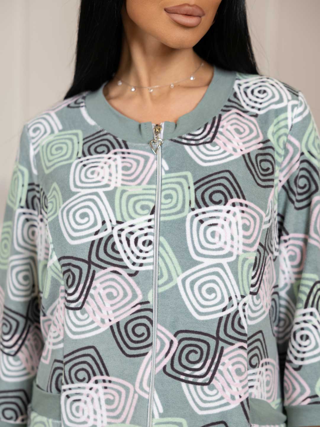 Халат из качественной турецкой махры полуприлегающего силуэта, длиной чуть ниже колена,с контрастной отделкой по горловине, карману и манжену рукава. Рост модели 168см