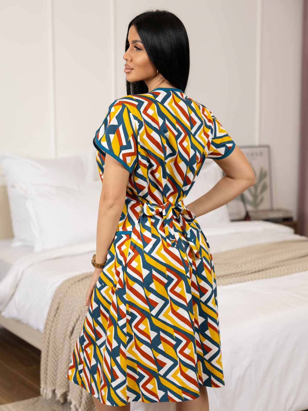 Женский домашний халат из хлопка, полуприлегающего силуэта с застежкой на молнию. Спереди на халате рельефные швы и два накладных кармана. Сзади пояс, обеспечивающий прилегание по спинке и создающий силуэт песочные часы.