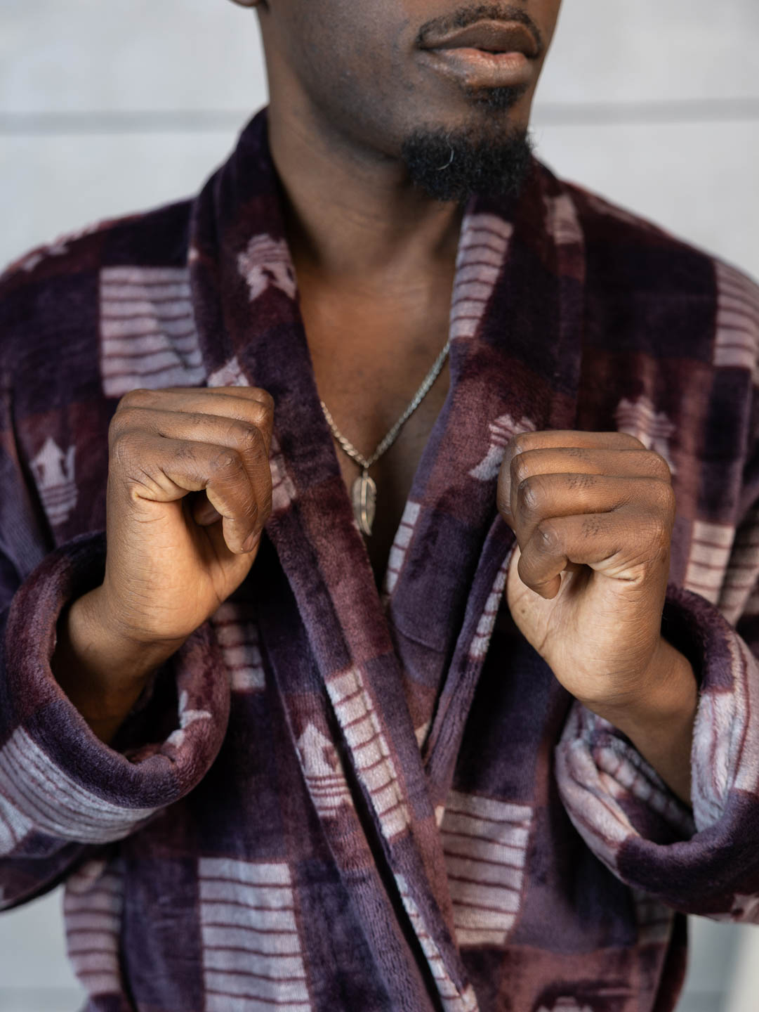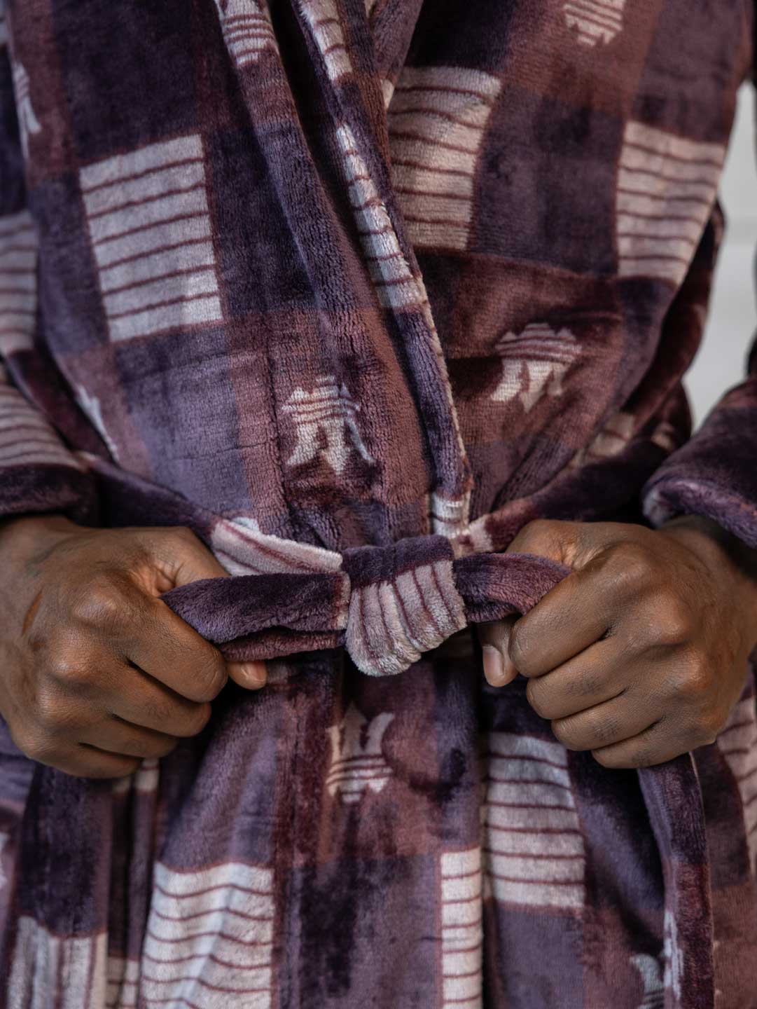 Халат мужской полуприлегающего силуэта из трикотажного полотна «велсофт». Изделие на запах, на поясе. На полочке присутствуют накладные карманы. Вырез горловины V-образный. Рукав втачной длинный.