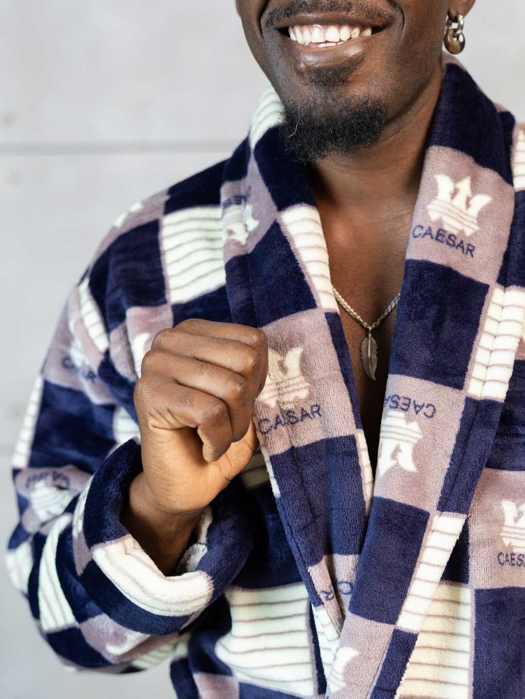 Халат мужской полуприлегающего силуэта из трикотажного полотна «велсофт». Изделие на запах, на поясе. На полочке присутствуют накладные карманы. Вырез горловины V-образный. Рукав втачной длинный.