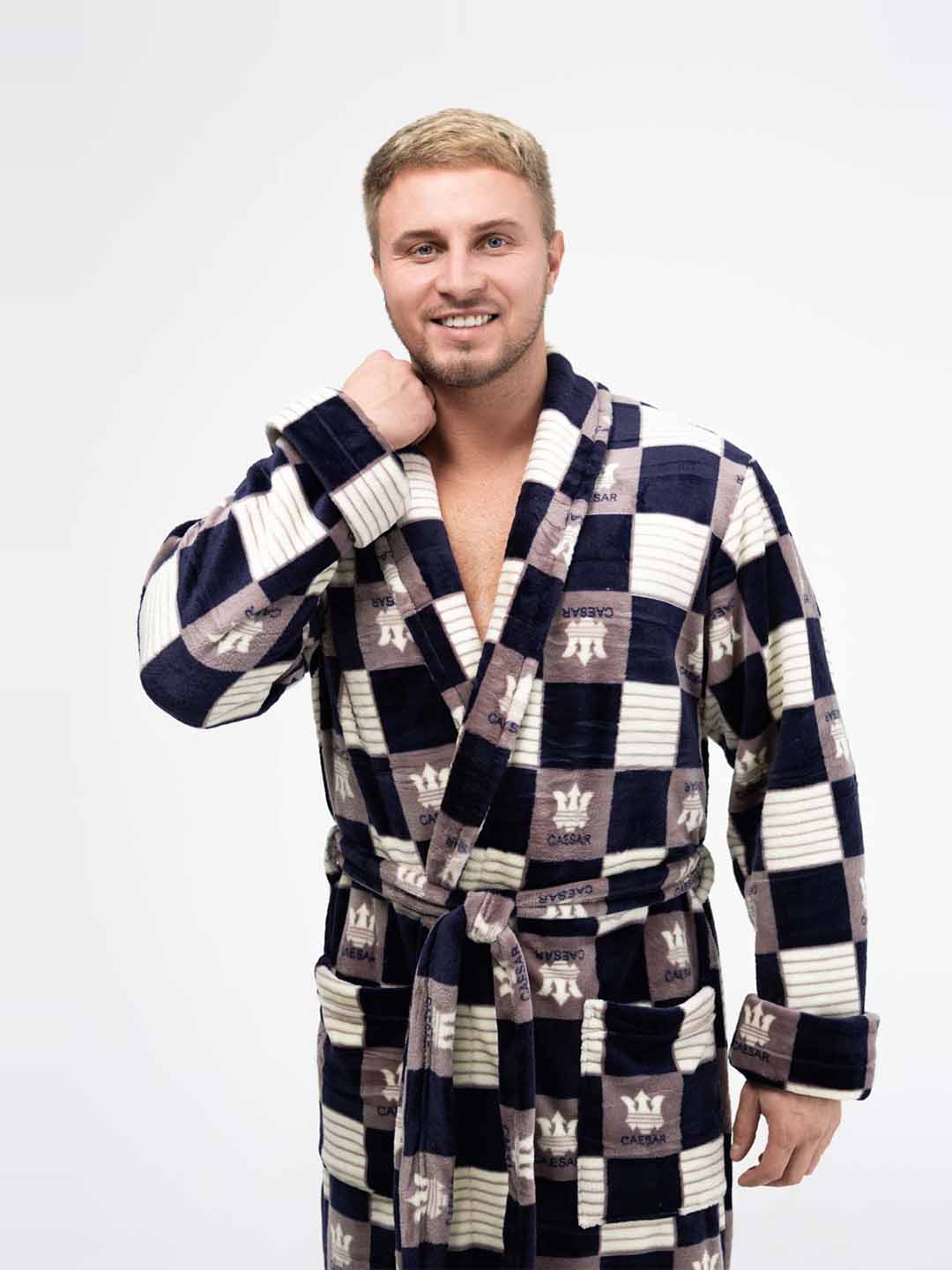 Халат мужской полуприлегающего силуэта из трикотажного полотна «велсофт». Изделие на запах, на поясе. На полочке присутствуют накладные карманы. Вырез горловины V-образный. Рукав втачной длинный.