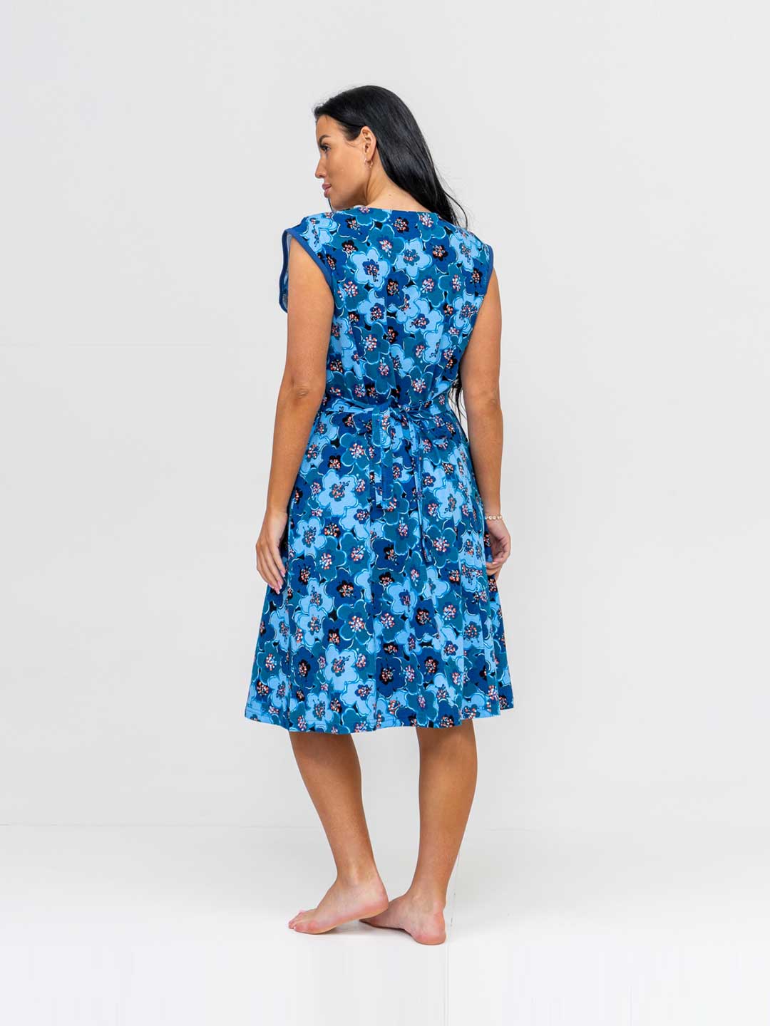 Халат женский полуприлегающего силуэта из комбинированного трикотажного полотна, длинной чуть ниже уровня колена. На полочке прорезные карманы с отделкой в верхней части. Вырез горловины П- образный, с отделкой. Изделие с рукавом - крылышко.