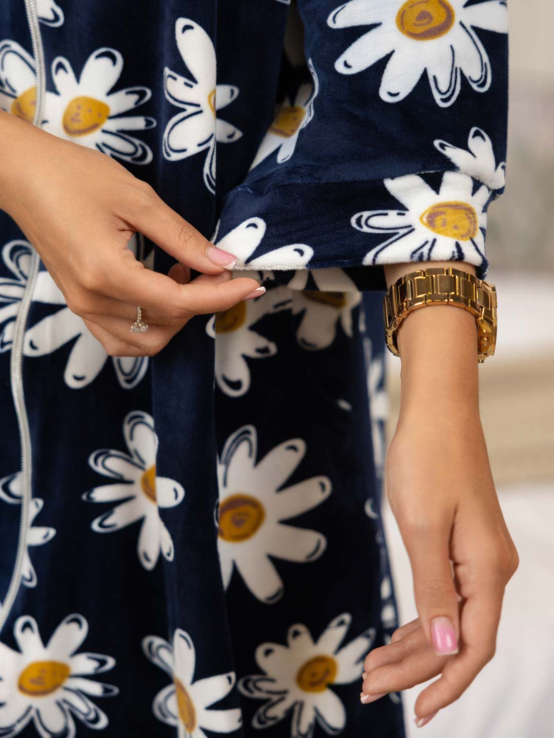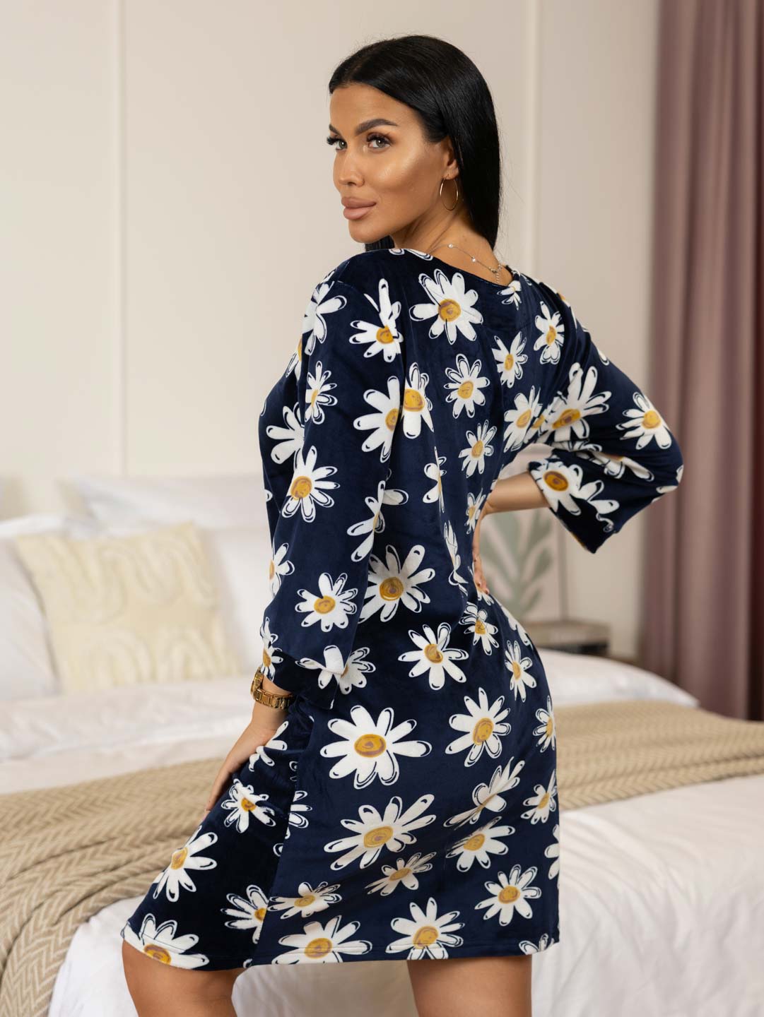 Женский халат из велюра, прямой силуэтной формы, с О-образной горловиной, на молнии и рукавом 3/4. Халат отлично подойдет на прохладную погоду.