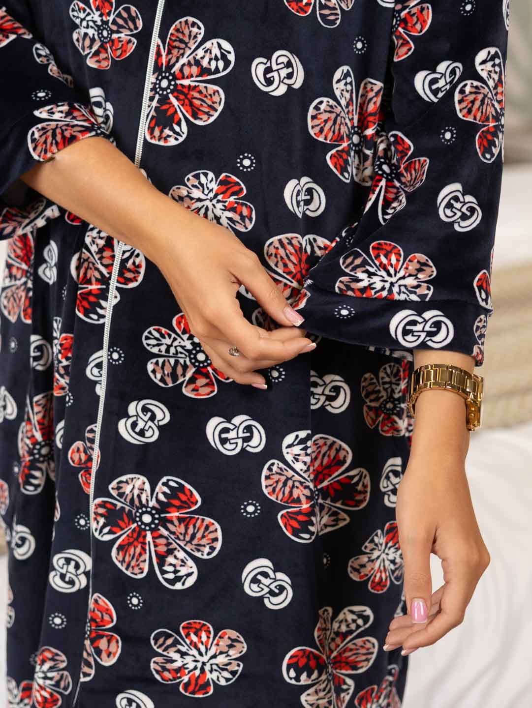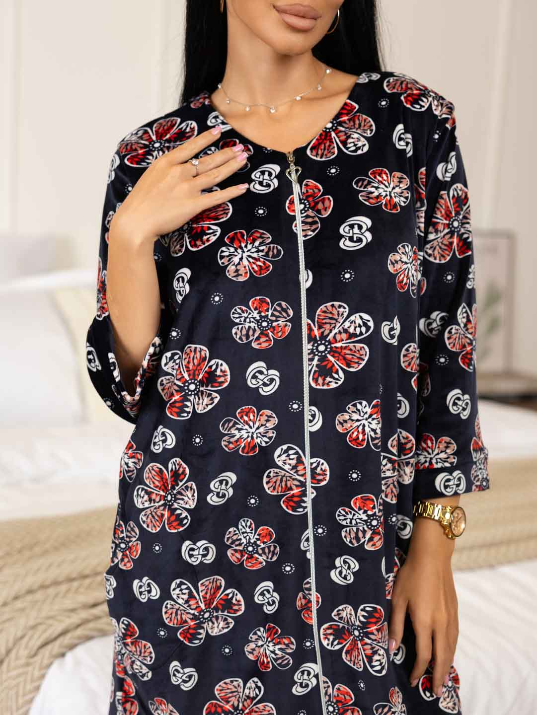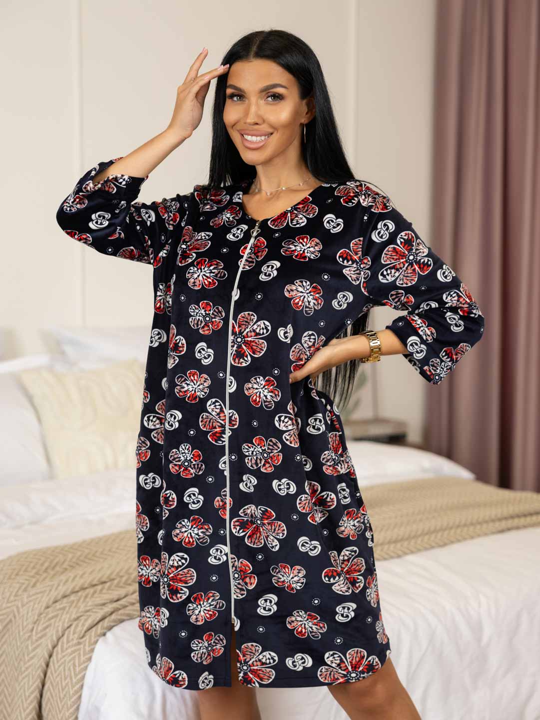 Женский халат из велюра, прямой силуэтной формы, с О-образной горловиной, на молнии и рукавом 3/4. Халат отлично подойдет на прохладную погоду.