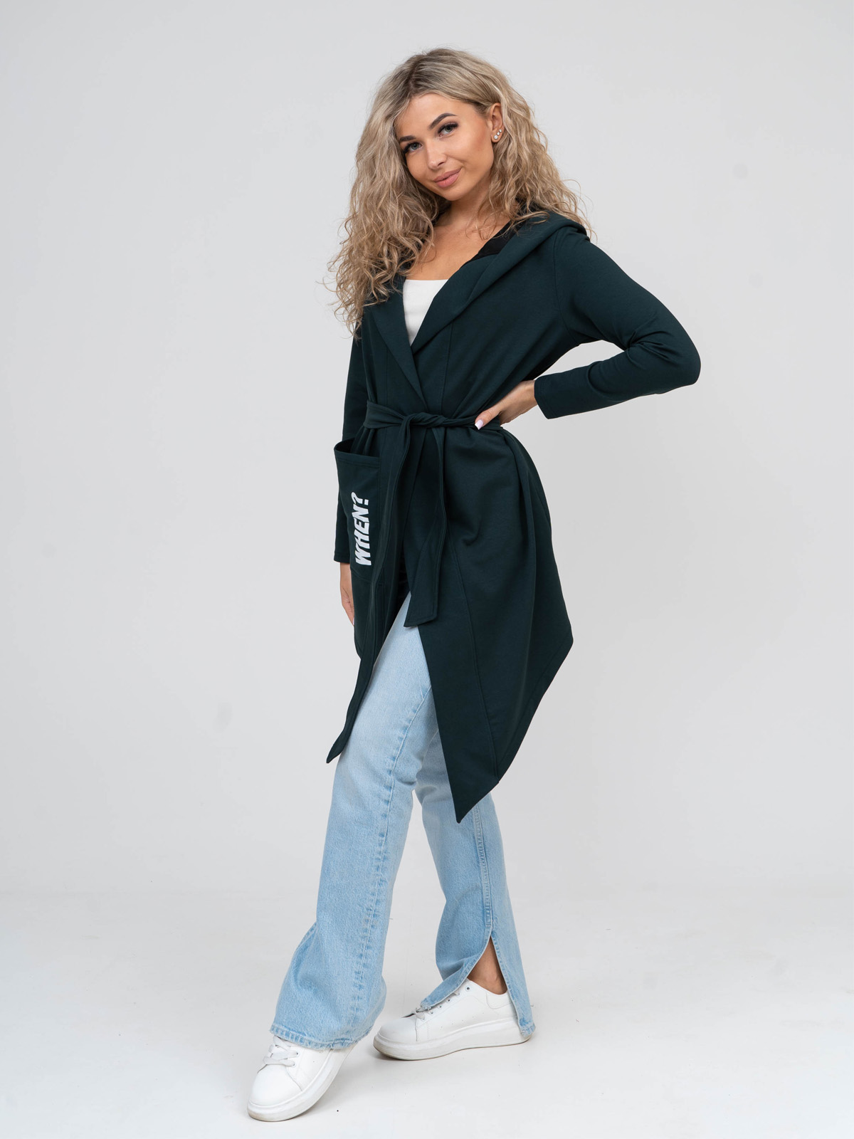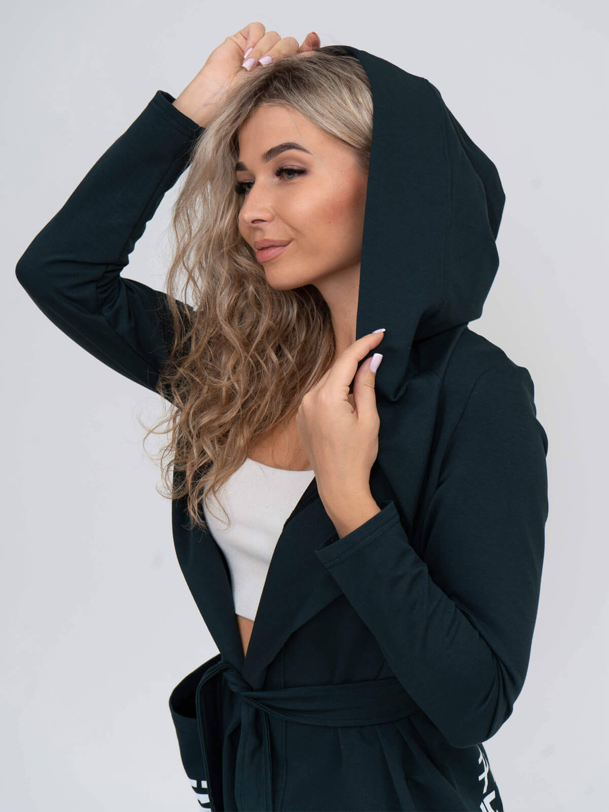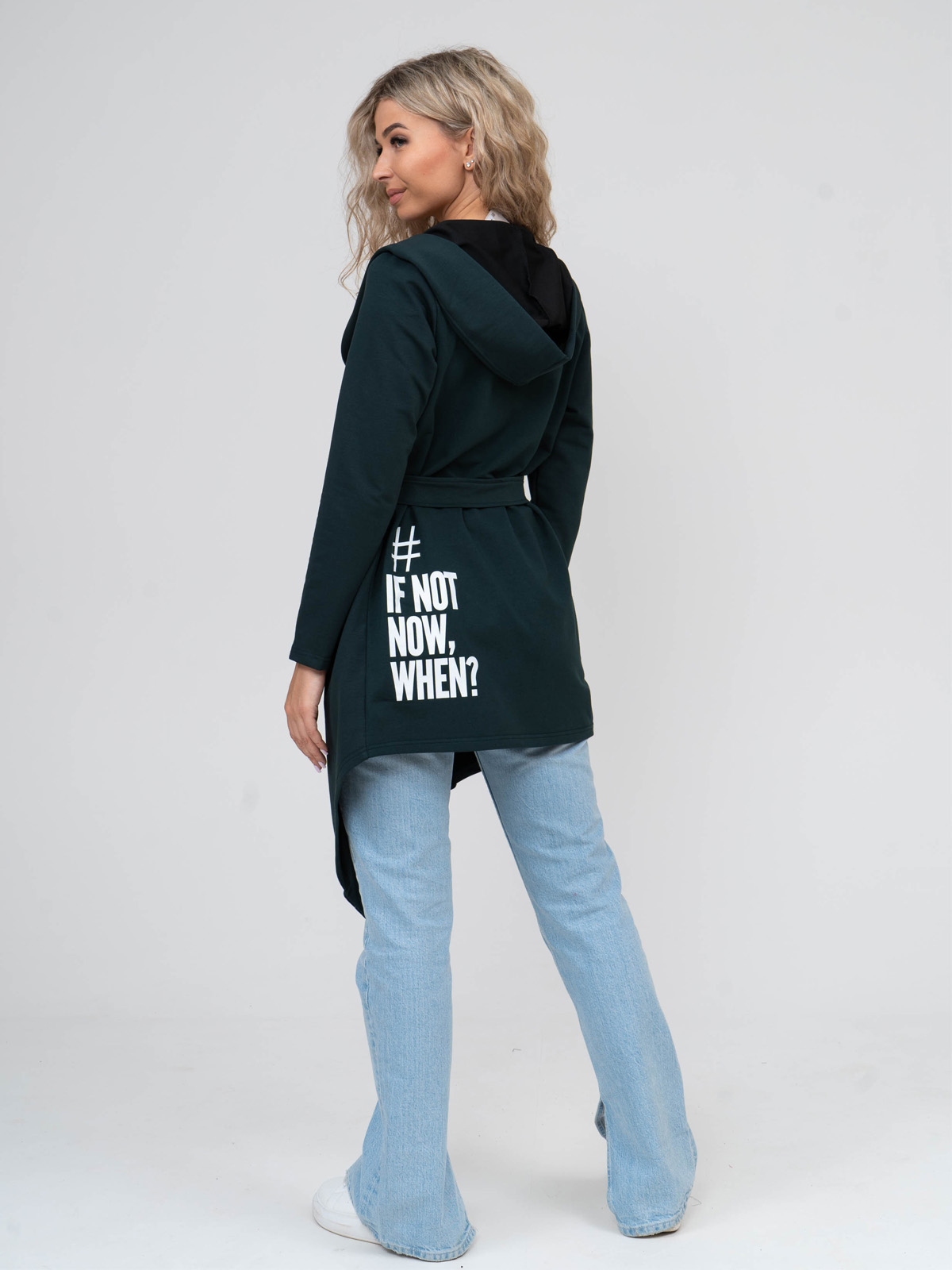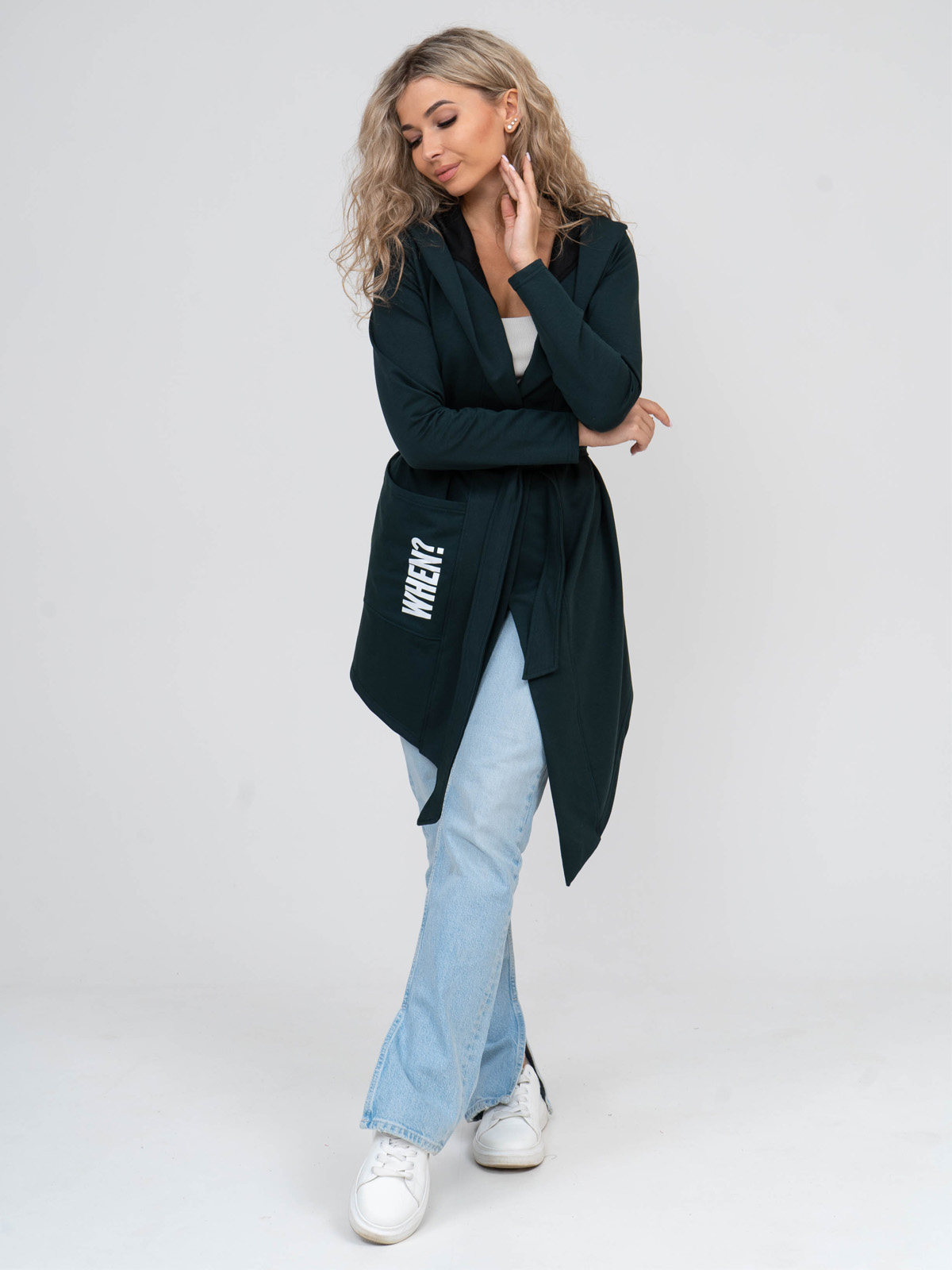 Кардиган женский с асимметричной линией низа, объемным капюшоном и карманом на правой стороне. Изделие укомплектовано поясом.