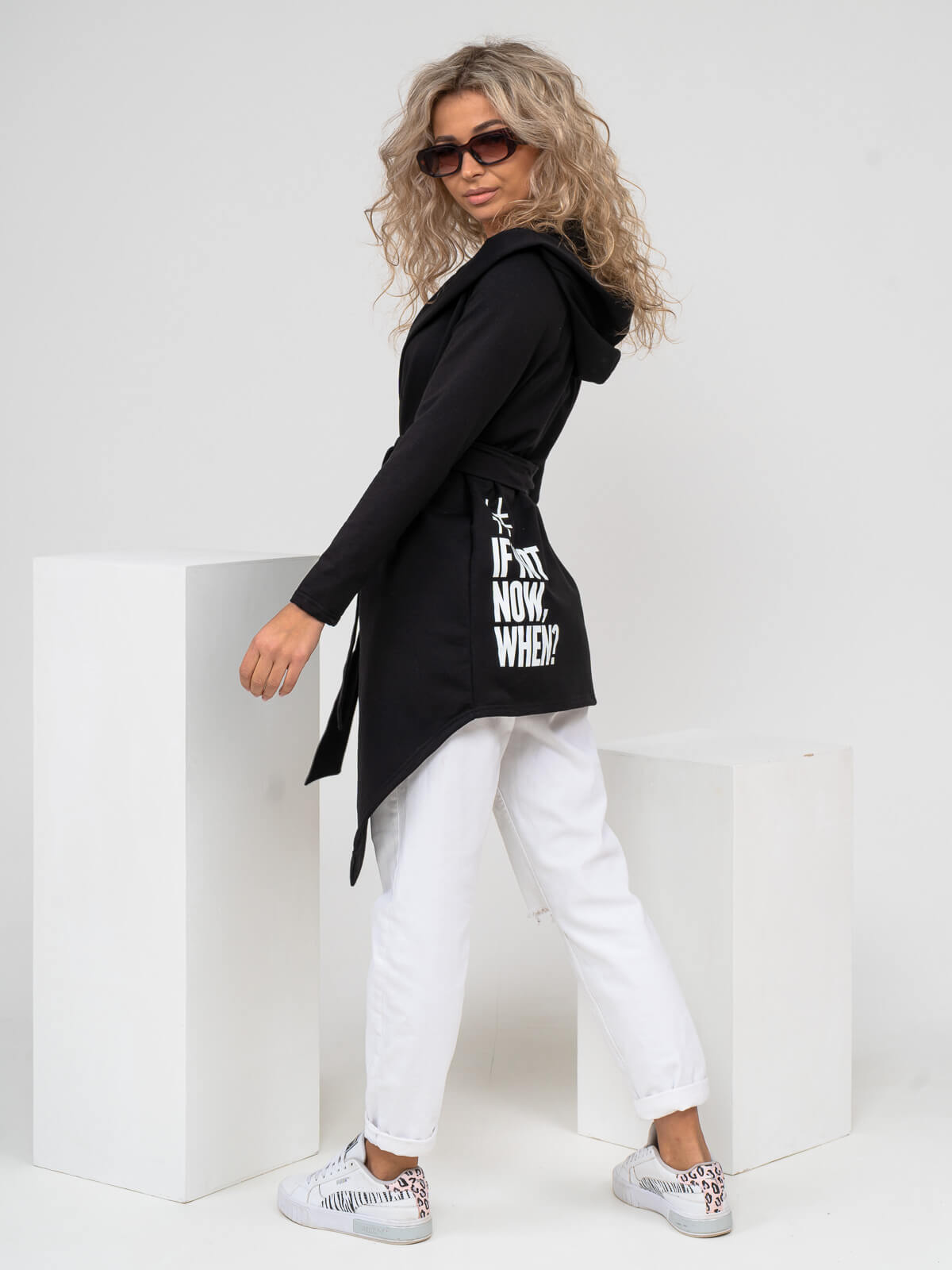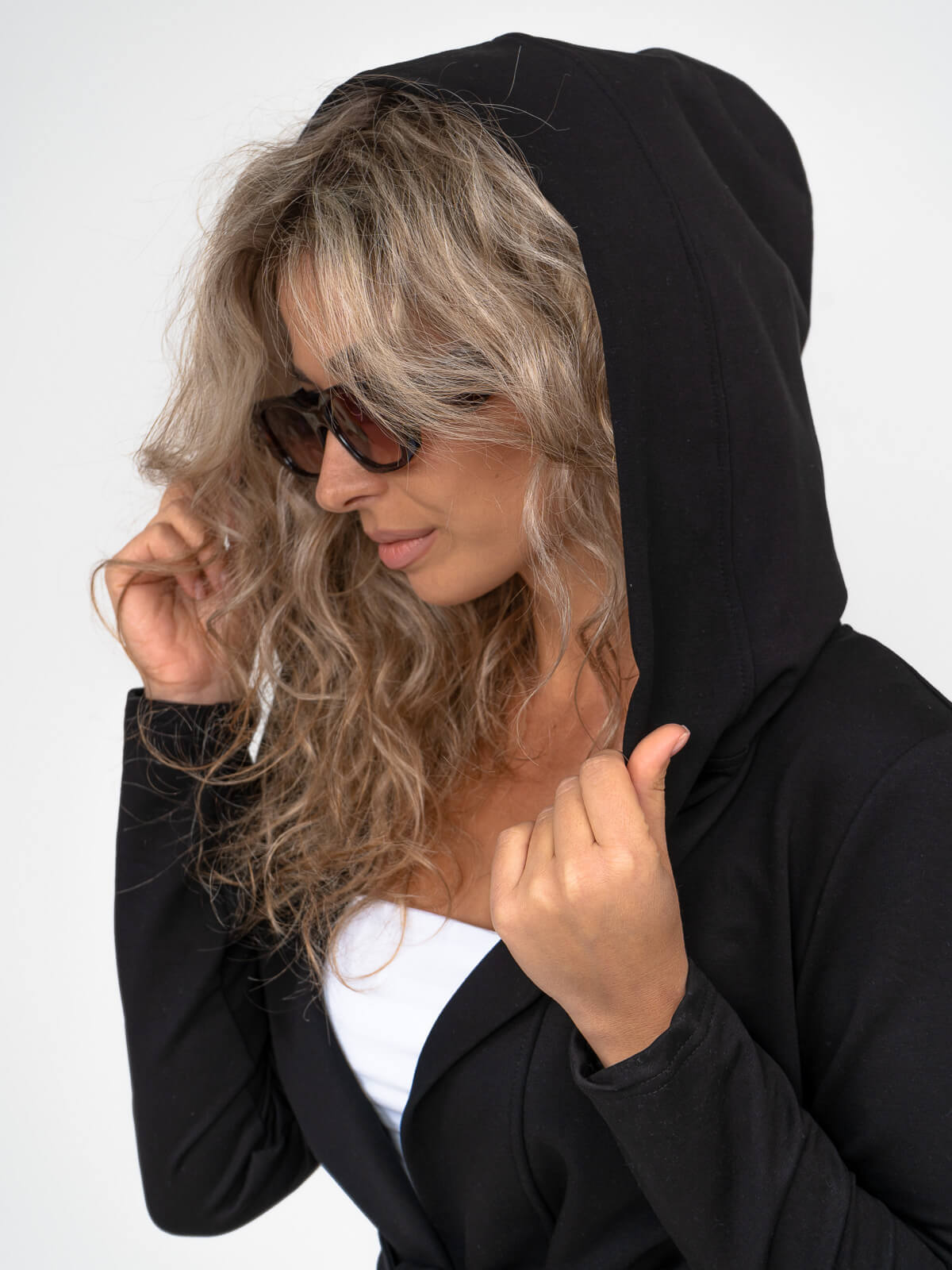 Кардиган женский с асимметричной линией низа, объемным капюшоном и карманом на правой стороне. Изделие укомплектовано поясом.