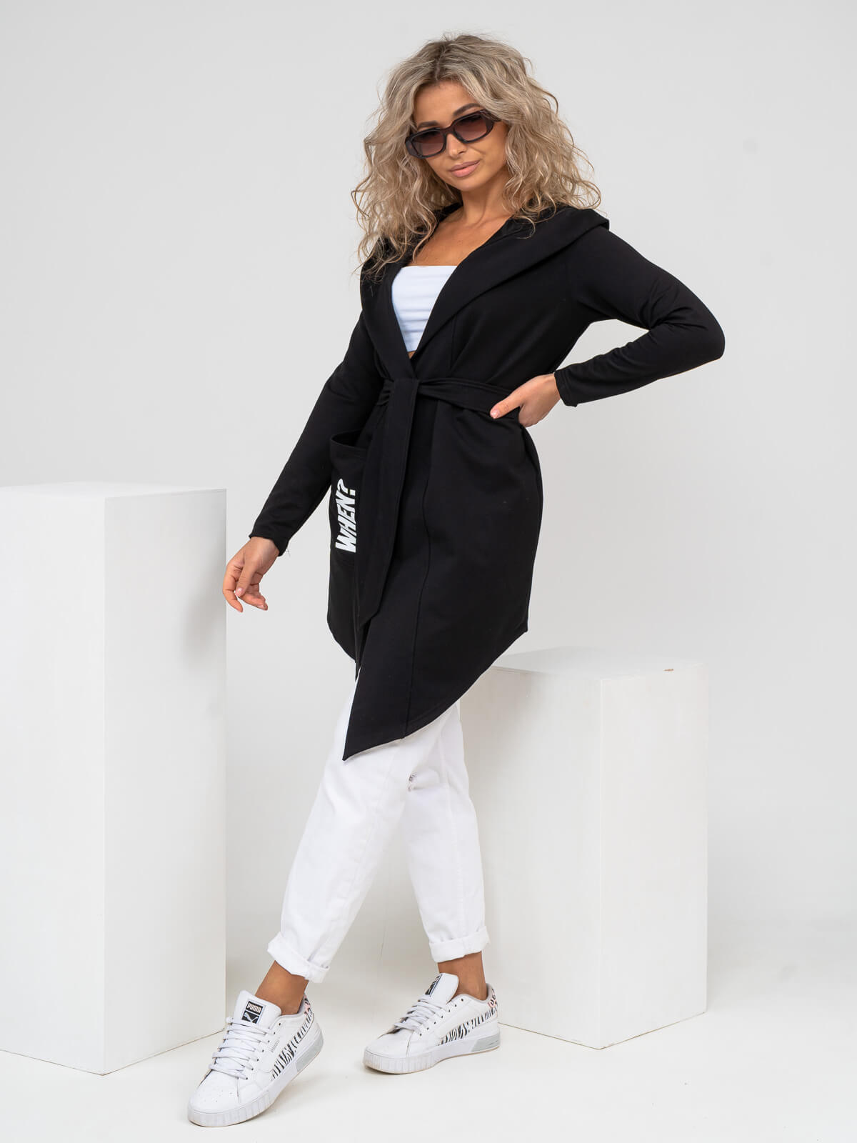 Кардиган женский с асимметричной линией низа, объемным капюшоном и карманом на правой стороне. Изделие укомплектовано поясом.