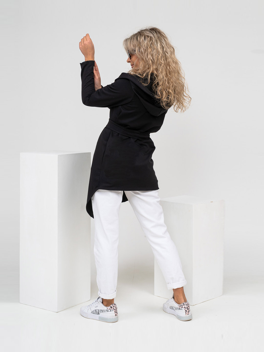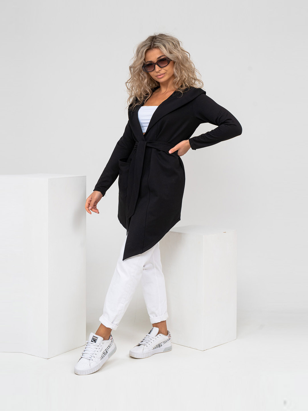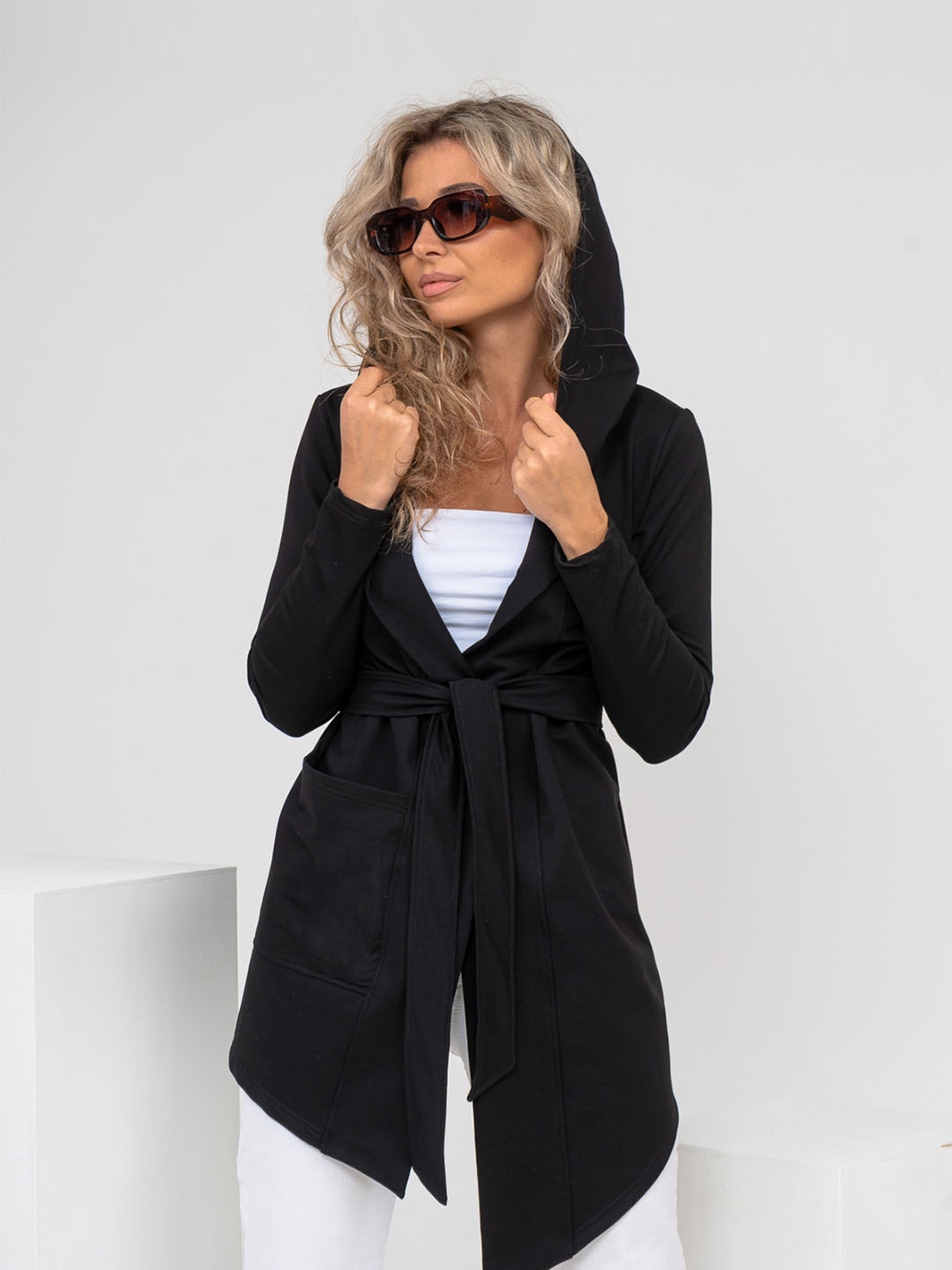 Женский ассиметричный кардиган с глубоким капюшоном и ассиметричной линией низа. Свободный крой не сковывает движения и подходит для любого типа фигуры. Приятный к телу материал обеспечит Вам комфорт в любое время года.