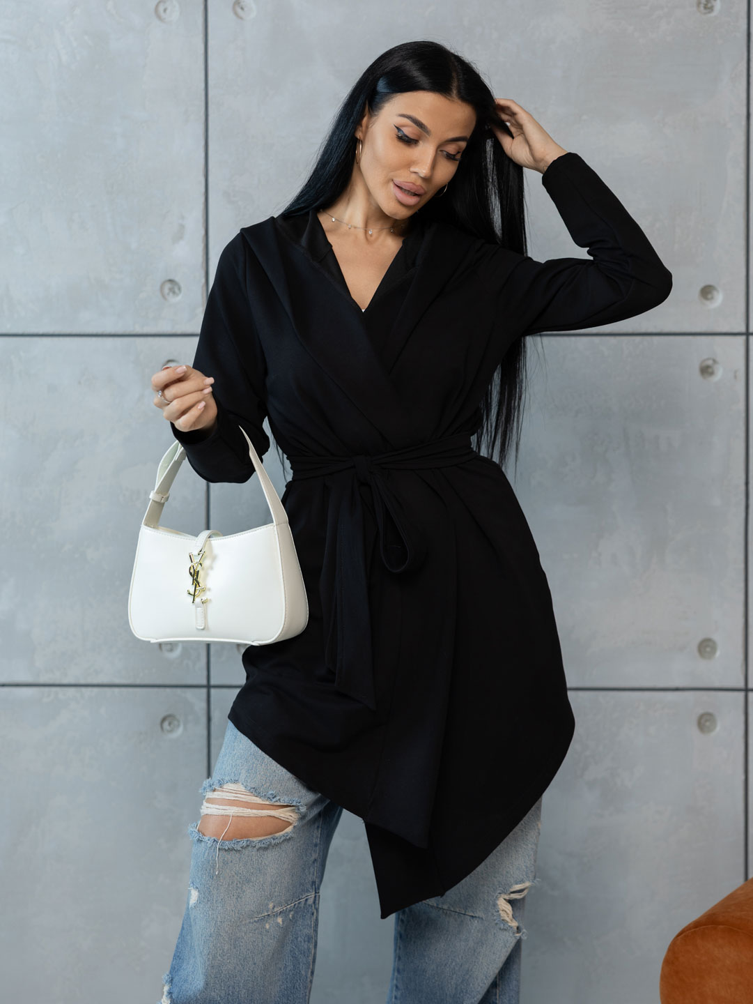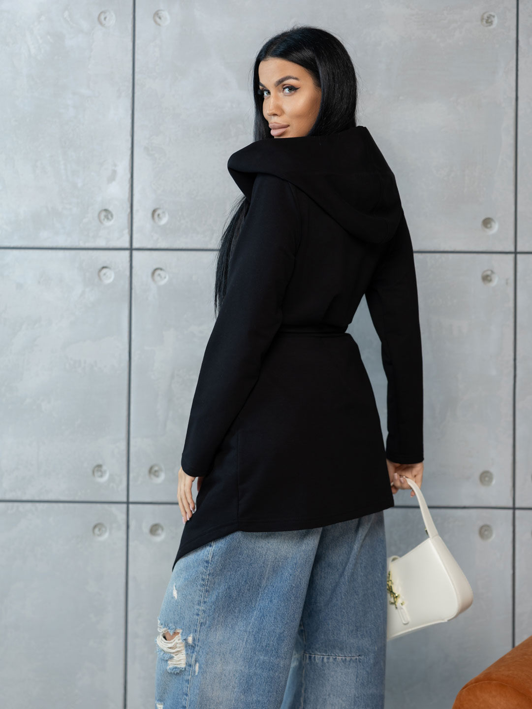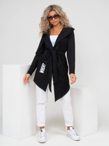 Женский ассиметричный кардиган с глубоким капюшоном и ассиметричной линией низа. Свободный крой не сковывает движения и подходит для любого типа фигуры. Приятный к телу материал обеспечит Вам комфорт в любое время года.
