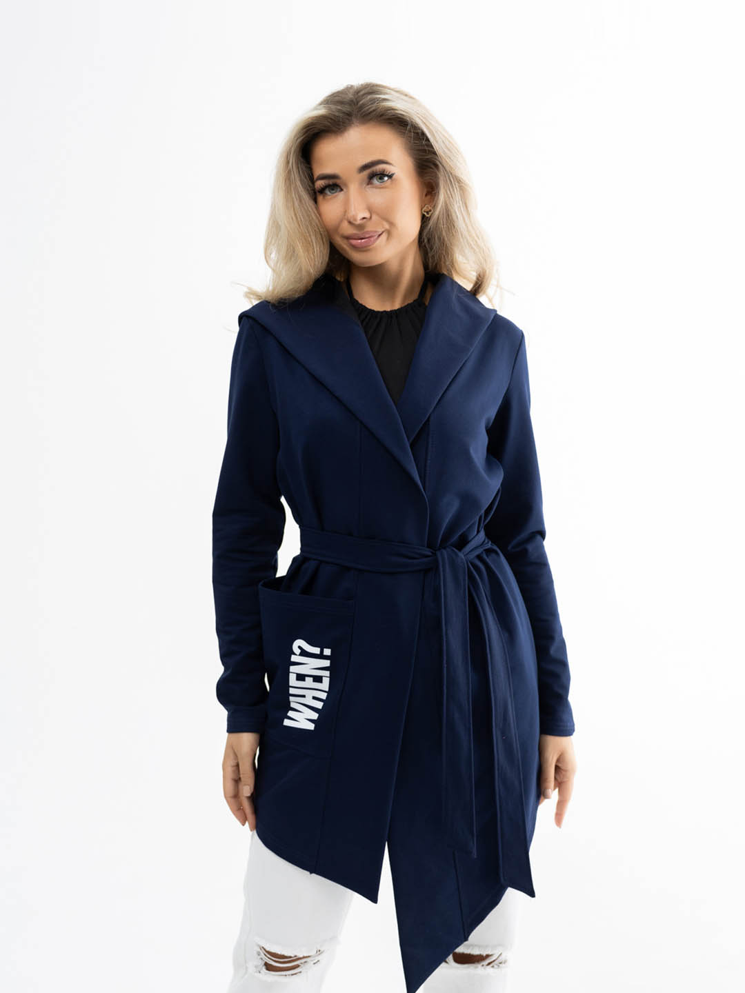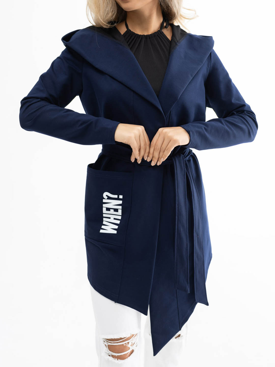 Кардиган женский с асимметричной линией низа, объемным капюшоном и карманом на правой стороне. Изделие укомплектовано поясом.