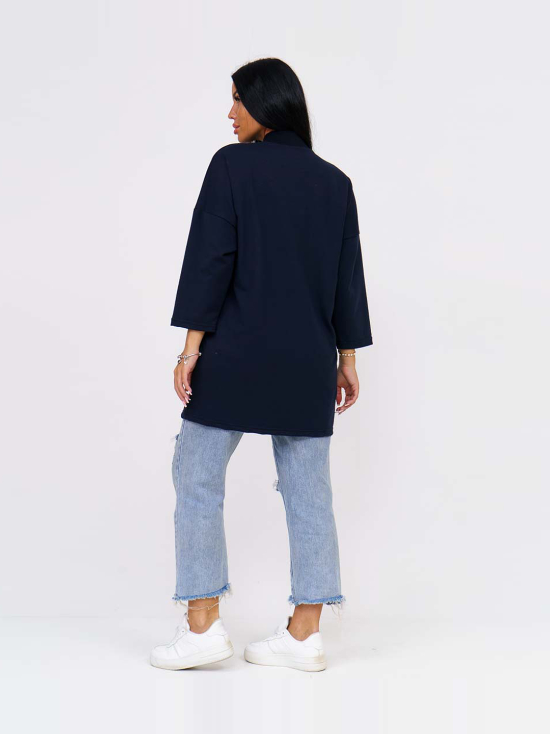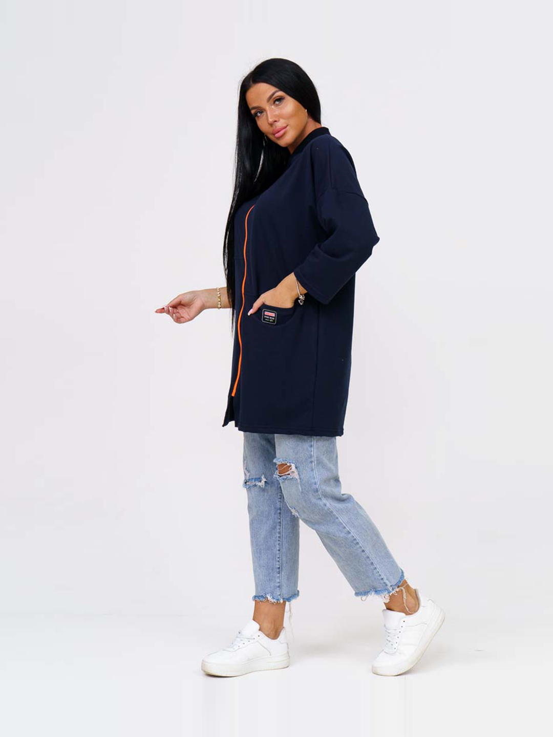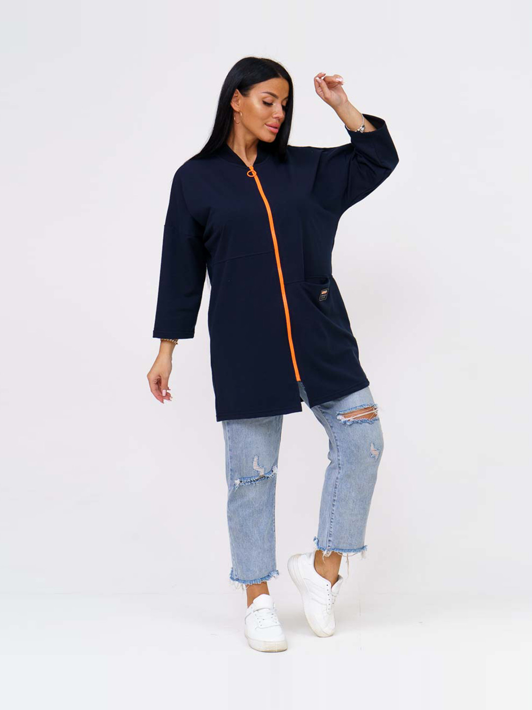 Кардиган женский на молнии,свободного силуэта длиной чуть ниже уровня бёдер. Полочка с ассиметричными швами, спереди в шве карман. Линия плеча спущена. Рукав втачной три четверти.Воротник из кашкорсе в цвет основного материала.
