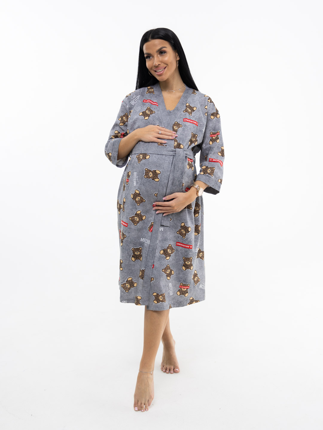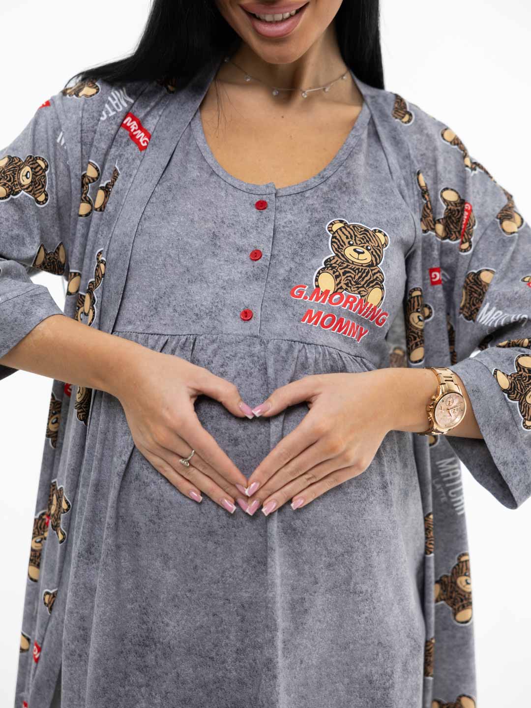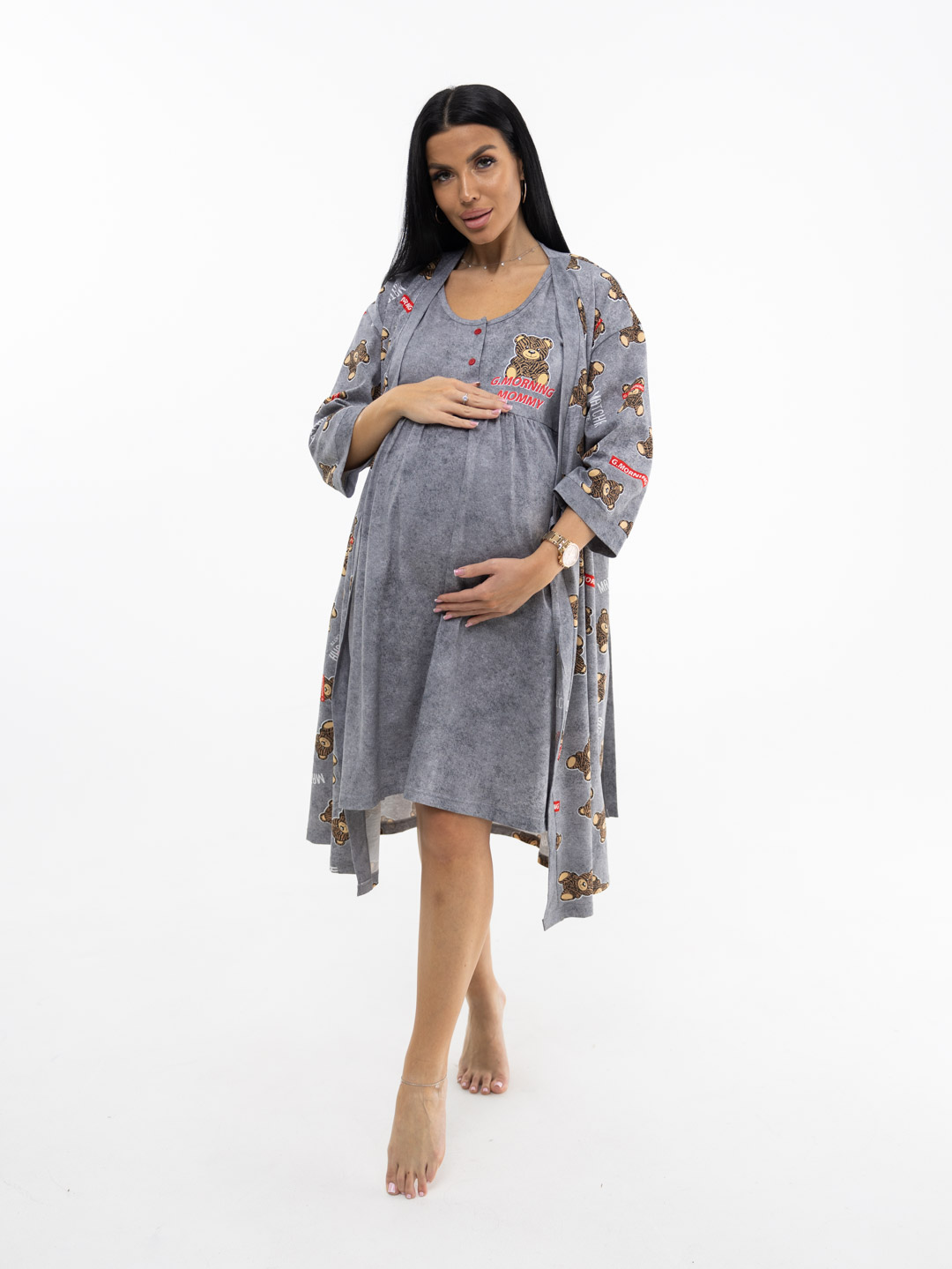 Представляем вам идеальный домашний комплект из 100% хлопка — мягкий и стильный халат с сорочкой для беременных, специально созданный для вашего комфорта. Комплект сочетает в себе элегантность и удобство, что делает его идеальным вариантом как для повседневного ношения, так и для особых моментов, таких как пребывание в роддоме. Халат на запах с длинным поясом-кушаком и карманами в боковых швах. Ночная сорочка с кокеткой на пуговицах, стильной печатью и складками спереди, для комфортного расположения животика.