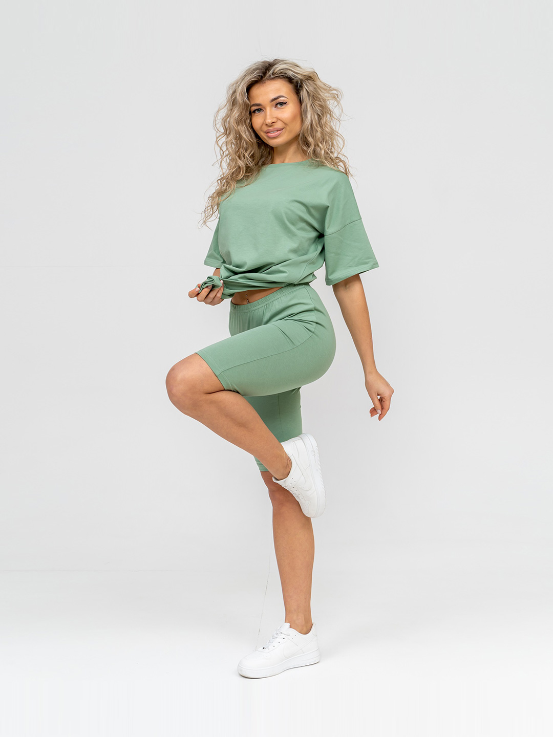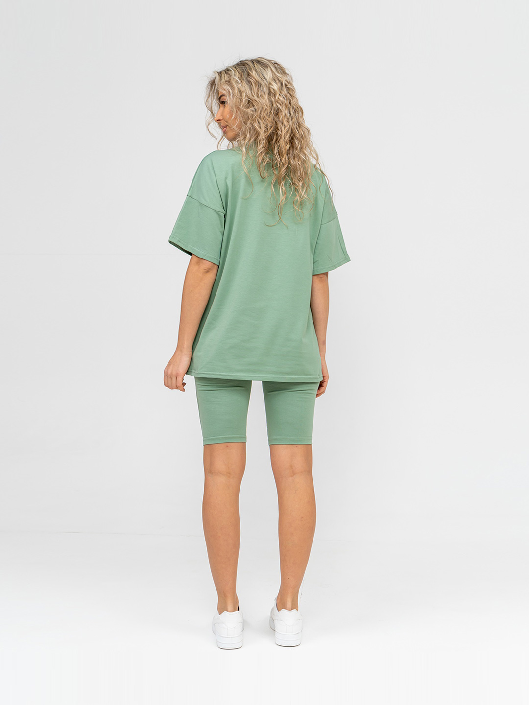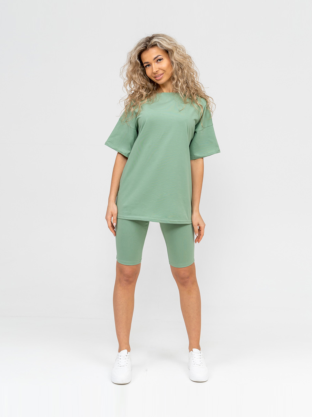 Молодежный костюм из кулирки с лайкрой. Футболка в стиле ОВЕРСАЙЗ с О-образной горловиной, длиной до середины бедра. Велосипедки прилегающей силуэтной формы выше уровня колена.