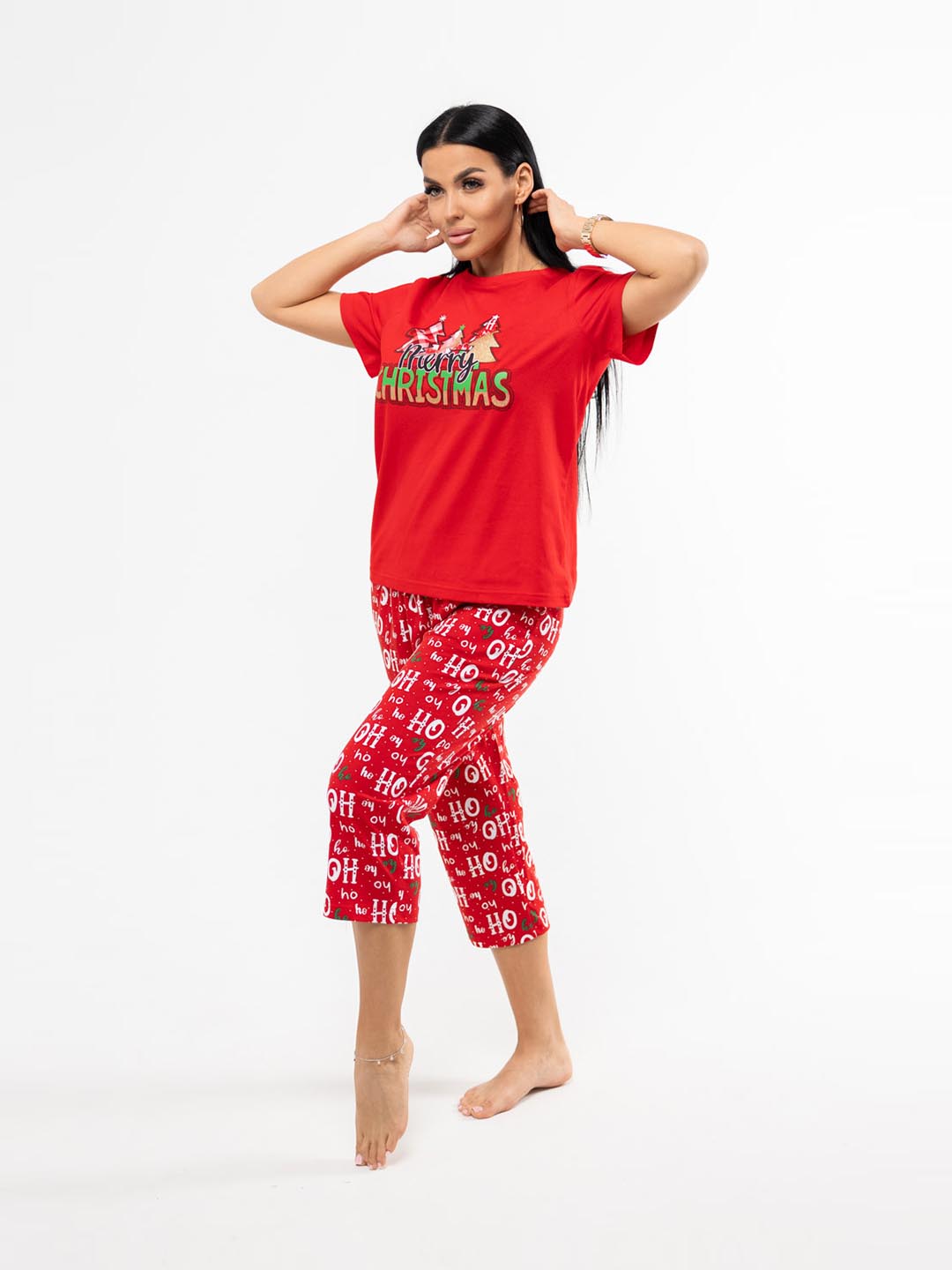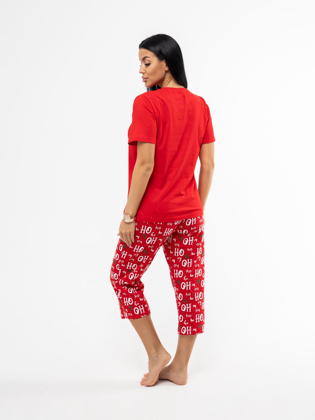 Новогодний костюм из 100% хлопка, уютный и мягкий. Базовая футболка с яркой новогодней печатью, поднимет Вам настроение. Классические бриджи на резинке с карманами будут идеальным вариантом для дома. Костюм отлично подойдет, как для повседневной носки в предновогодние дни, так и для тематической фотосессии.