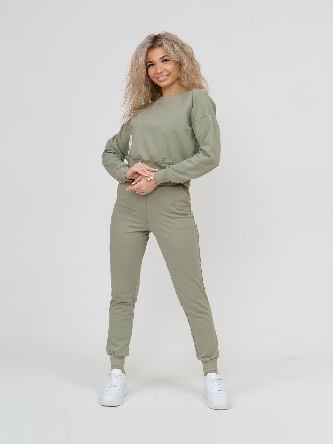 Костюм молодёжный полуприлегающего силуэта. Кофта со спущеным плечевым поясом укороченная. Рукав длинный на манжете. По низу изделия пояс. Брюки на манжете. На передних половинках присутствует карман в отрезном бочке. Верхний срез брюк обрабатывается поясом на резинке. Вырез горловины О-образный, обработанный планкой.