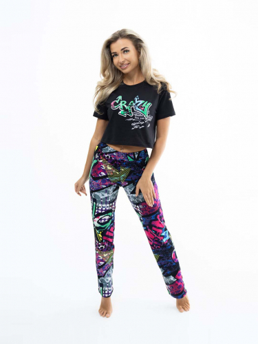 Костюм из 100% хлопка, с яркими брюками и укороченной футболкой, со стильной печатью спереди. Турецкая кулирка - обладает отменным качеством, принт на ней яркий и насыщенный. Печать выполнена профессиональной краской, за счет чего будет радовать Вас долгое время. Отличтельной особенностью данной модели является яркий молодежный дизайн стритстайл.