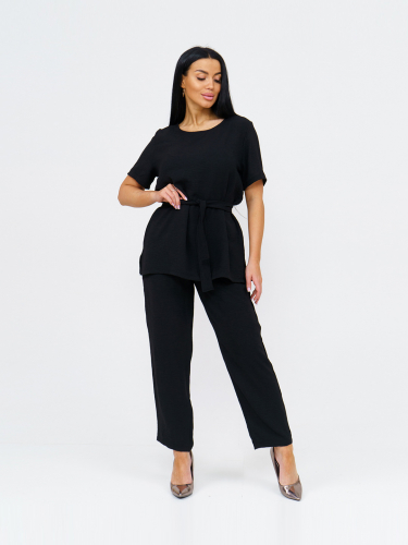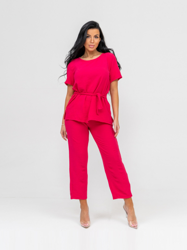 Женский костюм с кофтой и брюками из легкой ткани. Костюм отлично подходит для ярких повседневных весенне-летних образов, а также можно создать праздничный образ, дополнив костюм обувью на каблуке и аксессуарами. Для кофты имеется пояс. Вещи по отдельности можно сочетать с другими элементами гардероба. Плечи спущенные. Брюки на резинке.