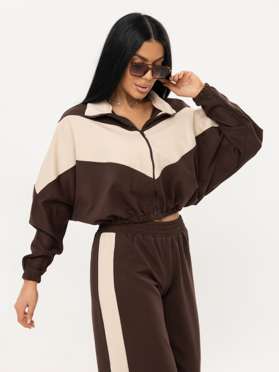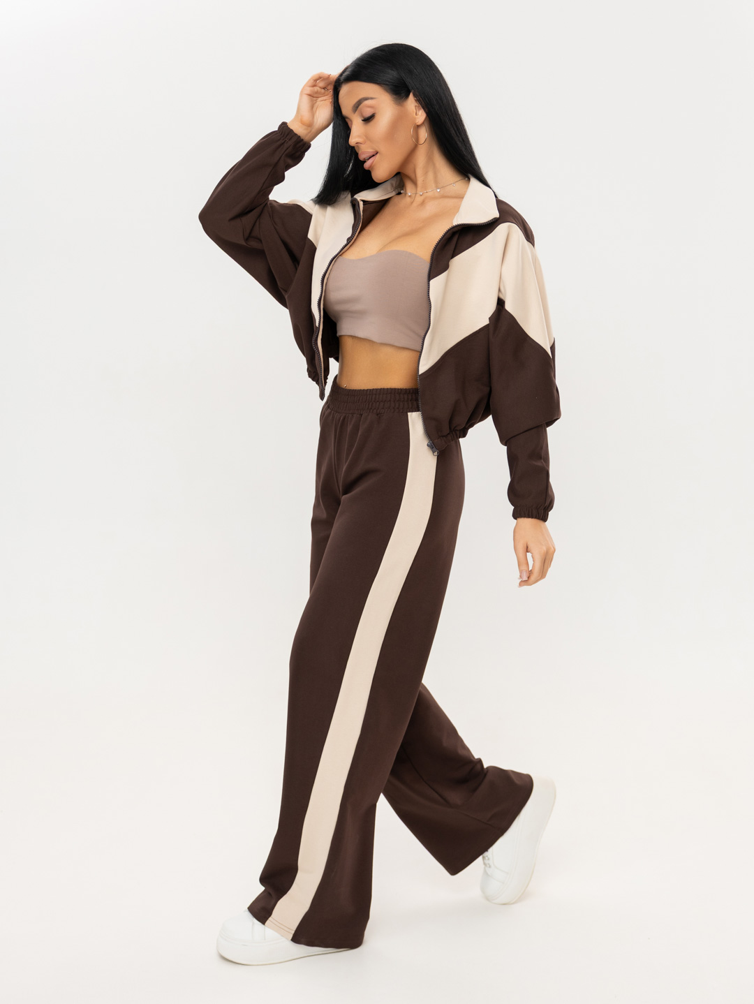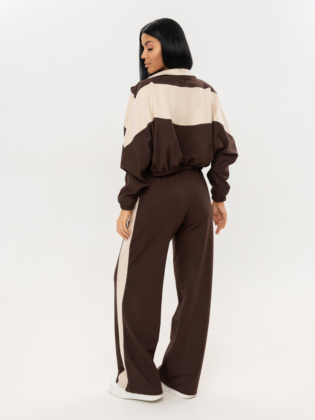 Женский спортивный костюм из футера двунитки. Укороченная олимпийка с резинкой 2см по низу и по рукаву, V-образные вставки и воротник с внутренней стороны выполнены из футера компаньона, внутри место соединения воротника и основы обработано окантовкой, использована качественная фурнитура. Брюки с широкими лампасами и поясом на резинке, выполненным на поясной машине.