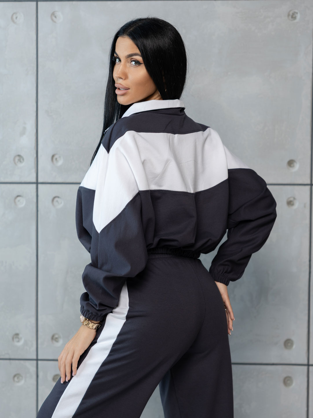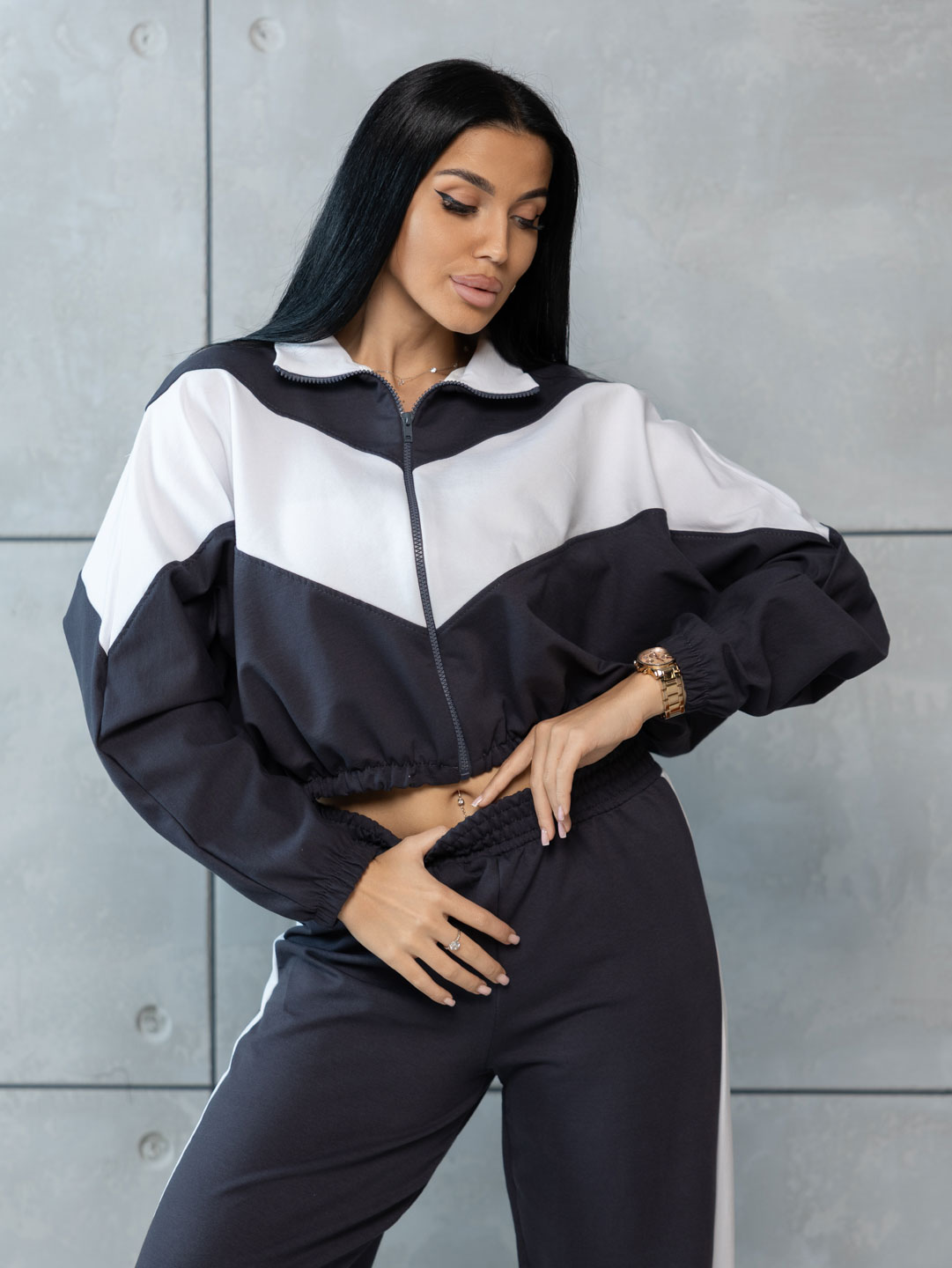 Женский спортивный костюм из футера двунитки. Укороченная олимпийка с резинкой 2см по низу и по рукаву, V-образные вставки и воротник с внутренней стороны выполнены из футера компаньона, внутри место соединения воротника и основы обработано окантовкой, использована качественная фурнитура. Брюки с широкими лампасами и поясом на резинке, выполненным на поясной машине.