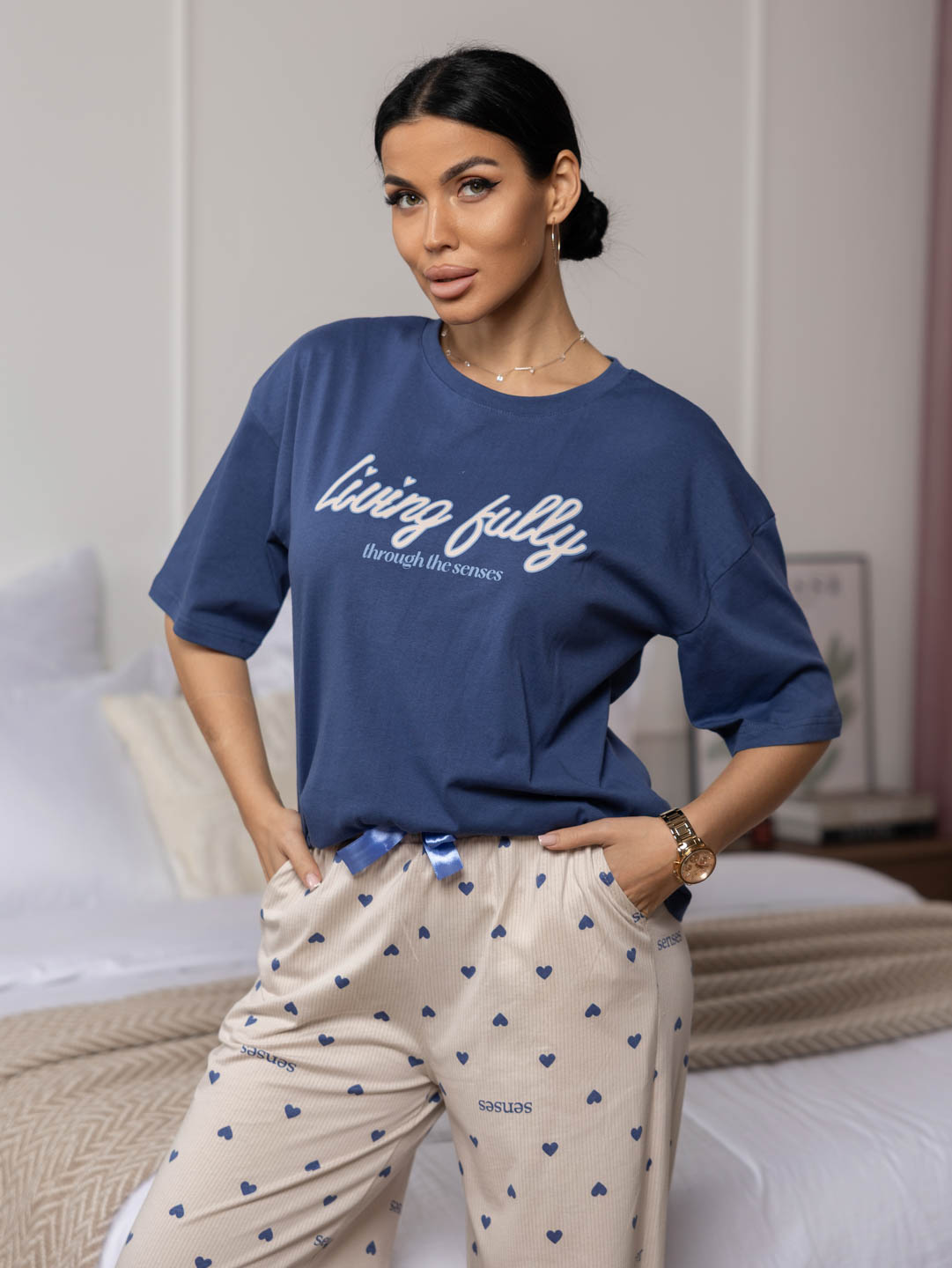 Домашний костюм из хлопка с принтом идеально подойдет для дома. Комплект состоит из брюк и футболки. Широкие брюки с карманами в милое сердечко и бантиком придадут игривости образу. Футболка со спущенной линией плеча и свободным силуэтом обеспечит комфорт во время отдыха, а печать придаст образу шарм. В нашем костюме Вы будите чувствовать себя неотразимо.