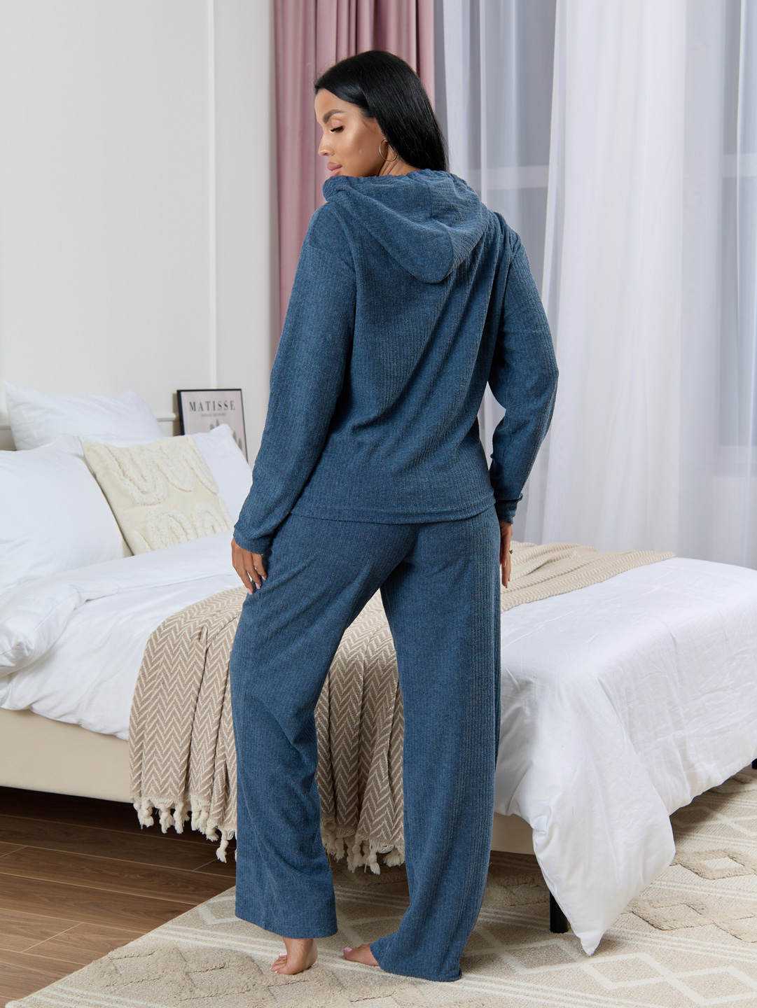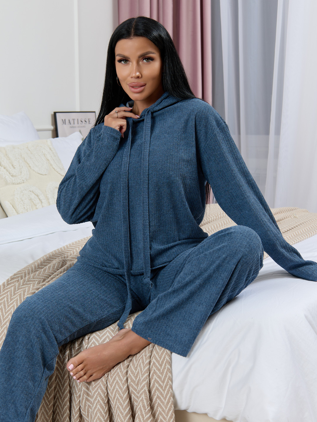Худи с капюшоном, длинным рукавом и шнурком из основного материала. Широкие брюки с накладными карманами.